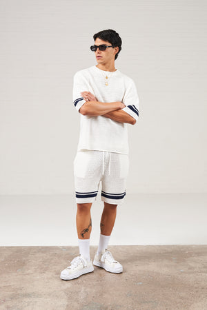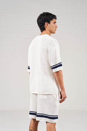 CROCHET KNITTED CONTRAST STRIPE T-SHIRT - WHITE