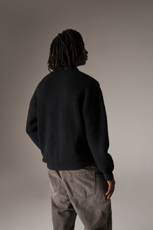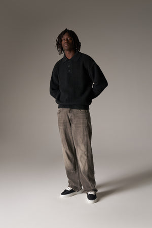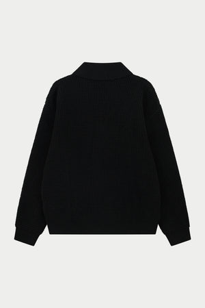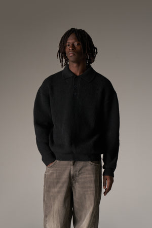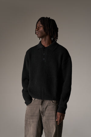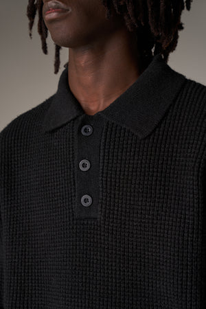 WAFFLE KNIT LONG SLEEVE POLO - BLACK