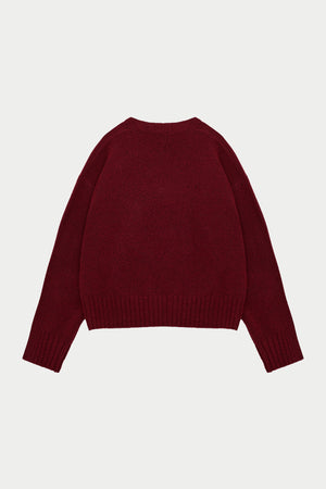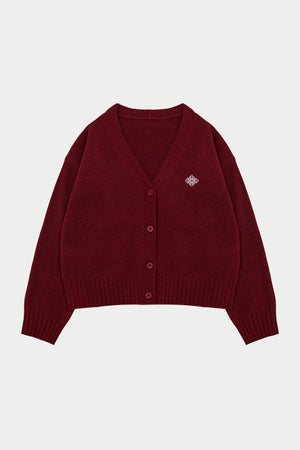FLUFFY KNIT EMBLEM EMBROIDERED CARDIGAN - BURGUNDY