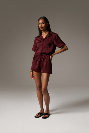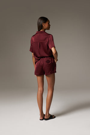 - Patch pocket to back with mixed embroidery and lace appliqué emblem