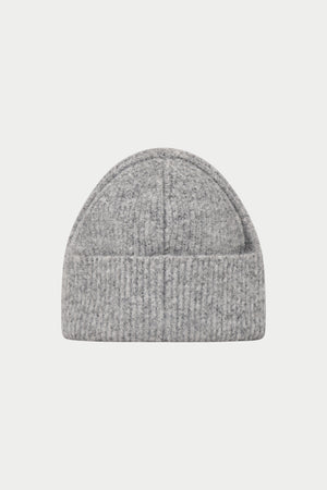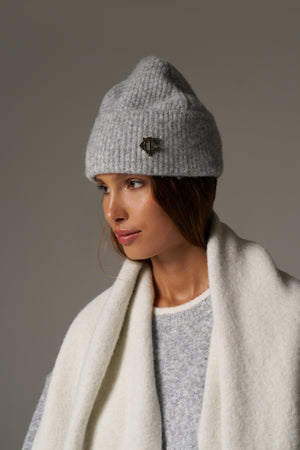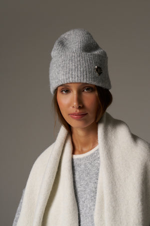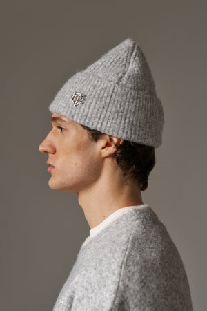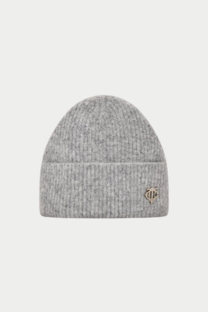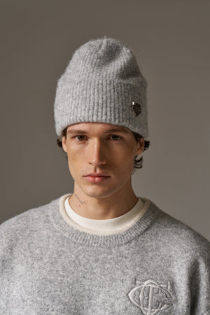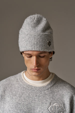 FLUFFY KNIT MONOGRAM PIN BADGE BEANIE - GREY