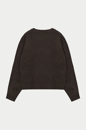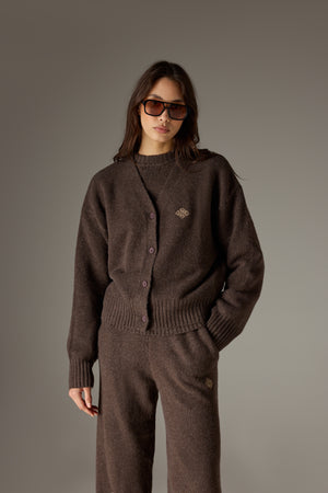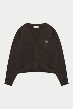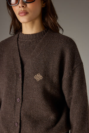 FLUFFY KNIT EMBLEM EMBROIDERED CARDIGAN - BROWN