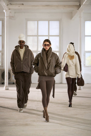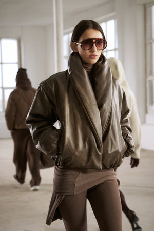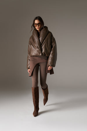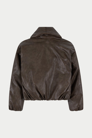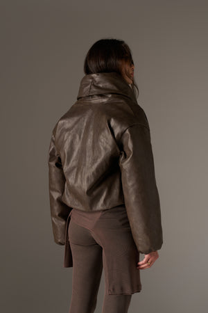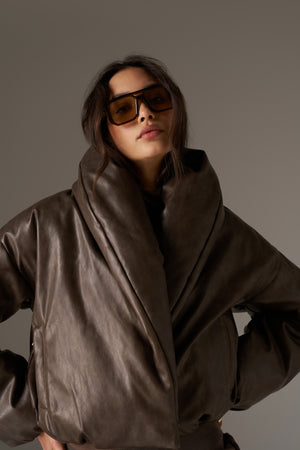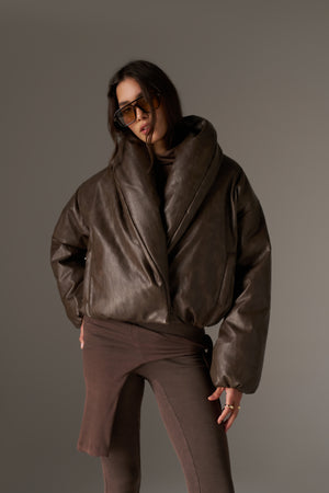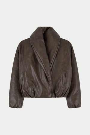 OVERSIZED COLLAR DISTRESSED FAUX LEATHER PUFFER COAT - BROWN