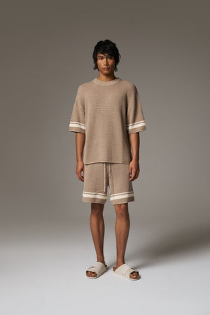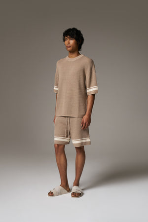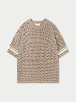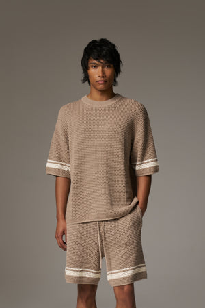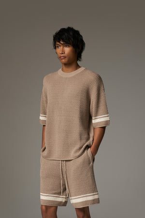 CROCHET KNITTED CONTRAST STRIPE T-SHIRT - BROWN