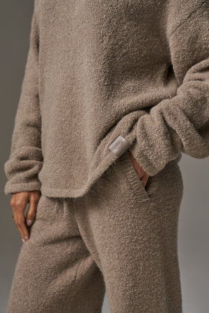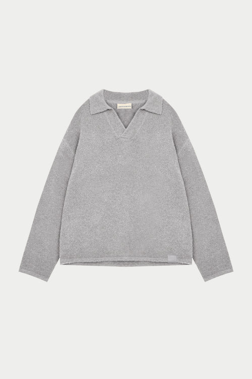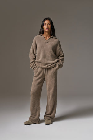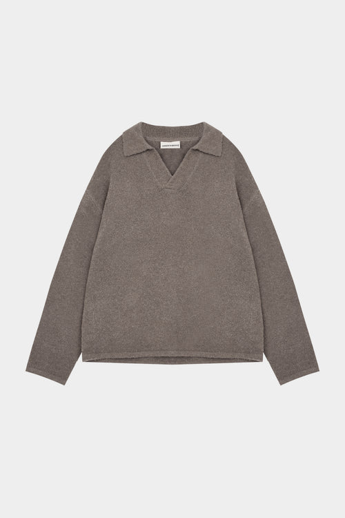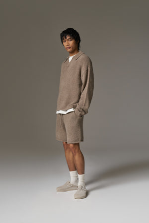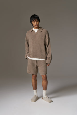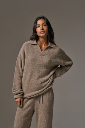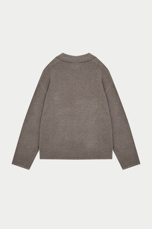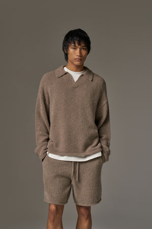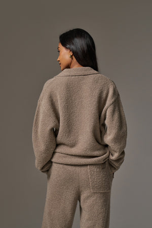 BOUCLE KNIT LONG SLEEVE POLO - BROWN
