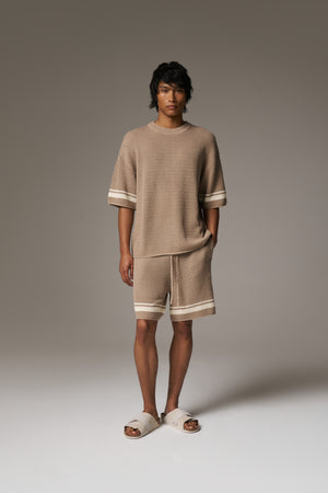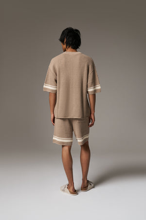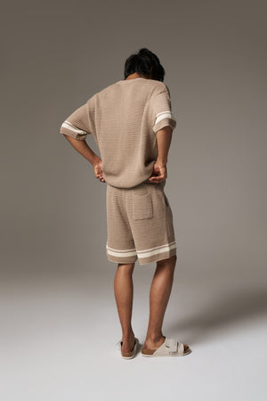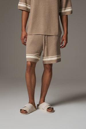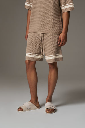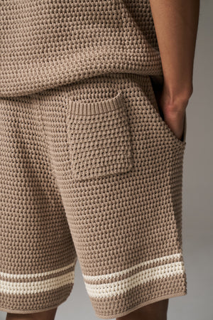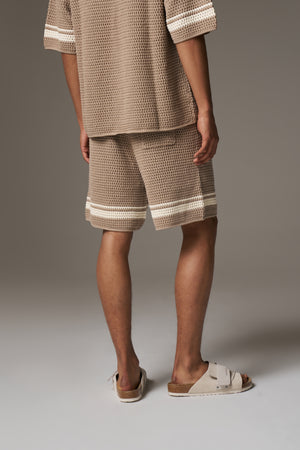 CROCHET KNITTED CONTRAST STRIPE SHORTS - BROWN