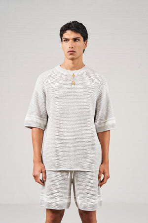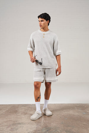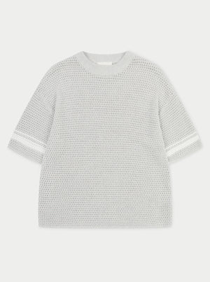 CROCHET KNITTED CONTRAST STRIPE T-SHIRT - GREY