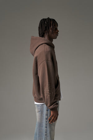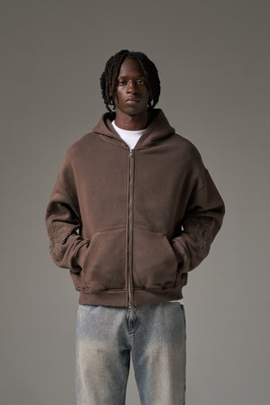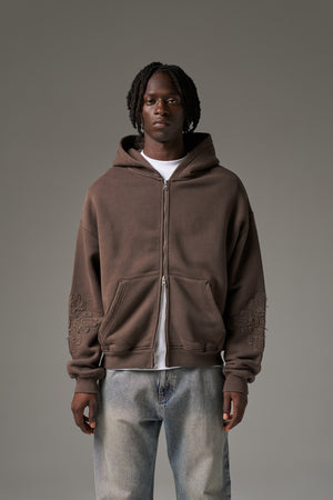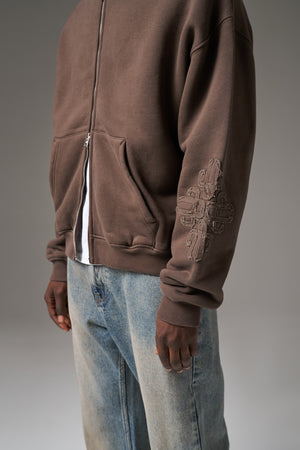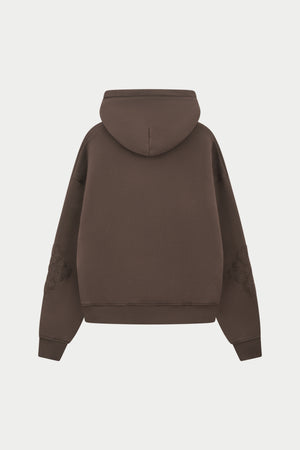 EMBLEM APPLIQUE ZIP THROUGH HOODIE - BROWN