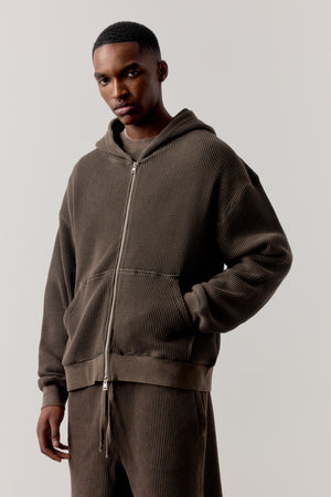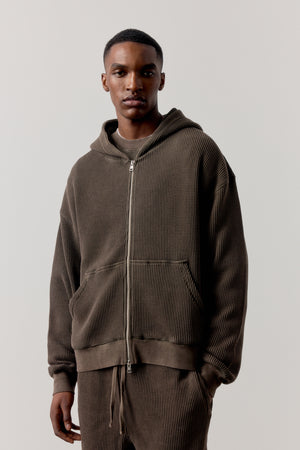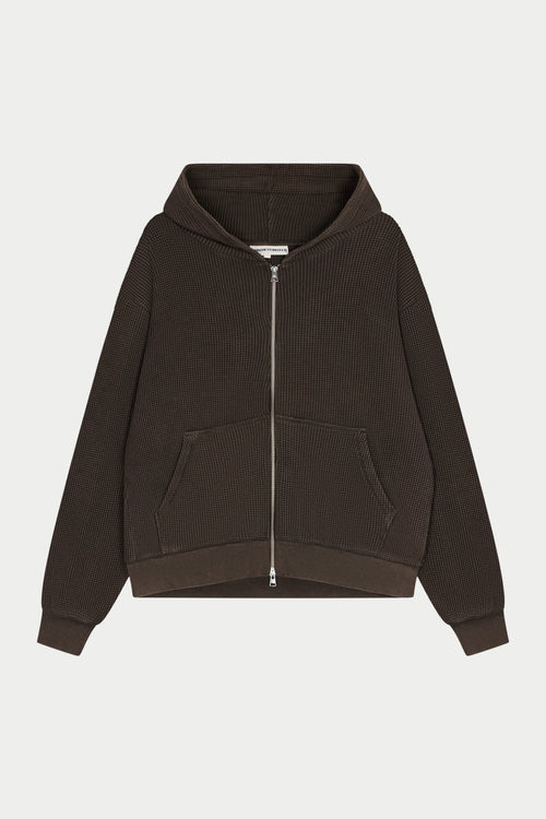 WAFFLE ZIP THROUGH HOODIE - BROWN