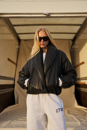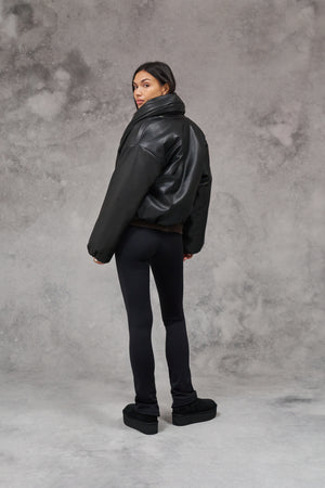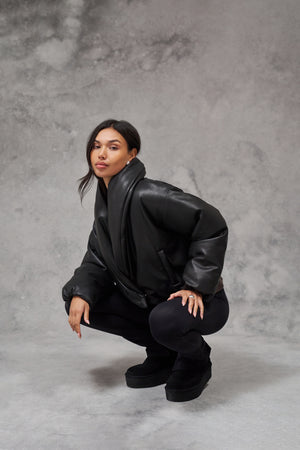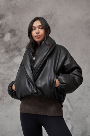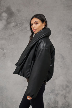 OVERSIZED COLLAR FAUX LEATHER PUFFER COAT - BLACK