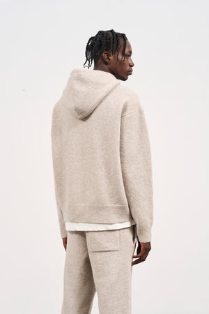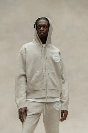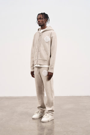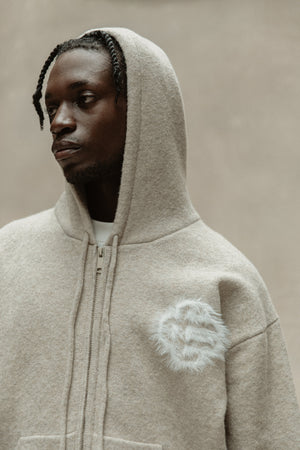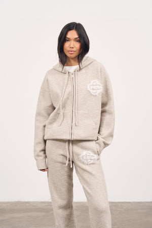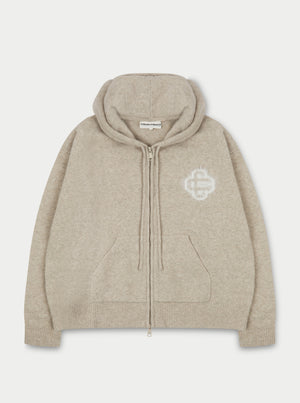 FLUFFY EMBLEM ZIP THROUGH KNITTED HOODIE - BEIGE