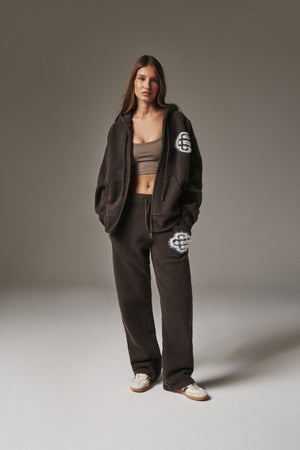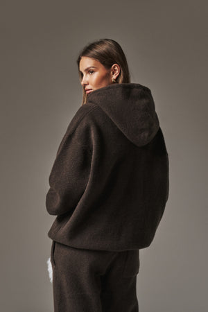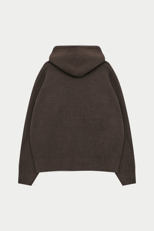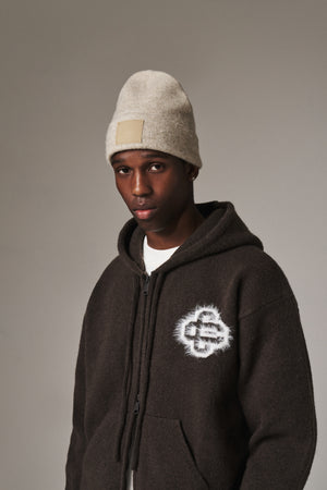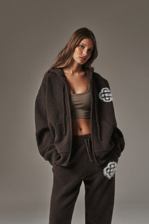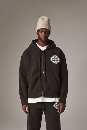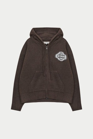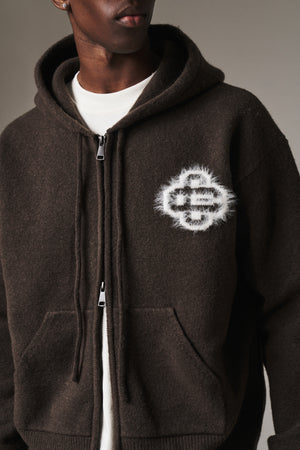 FLUFFY EMBLEM ZIP THROUGH KNITTED HOODIE - BROWN