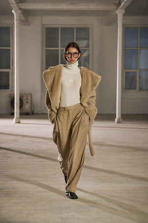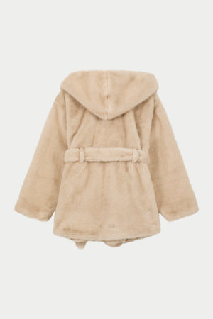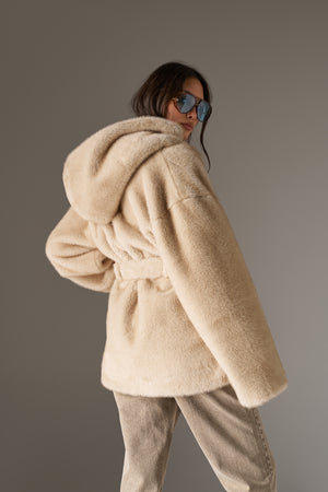 BELTED FAUX FUR HOODED COAT - BEIGE