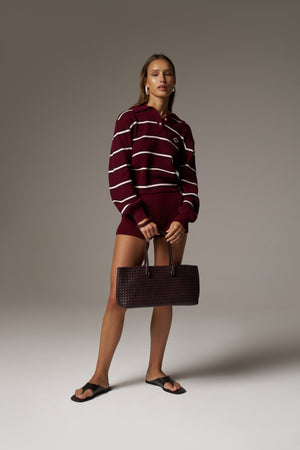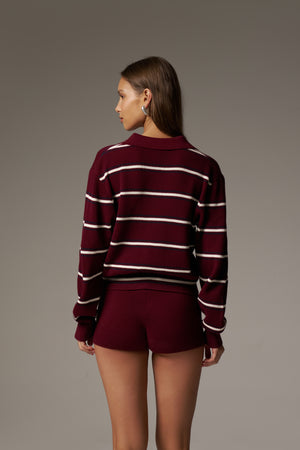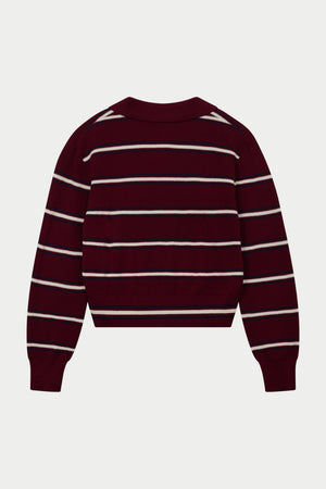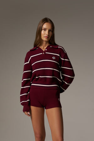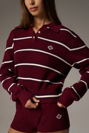 STRIPE KNITTED BUTTON THROUGH POLO - BURGUNDY
