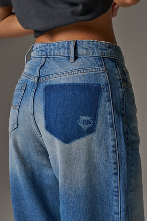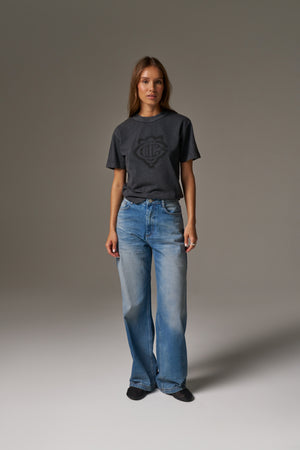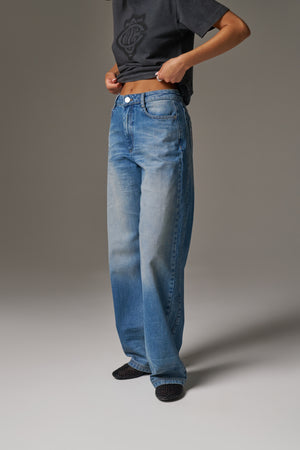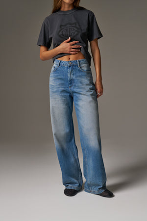 VINTAGE WASH MID RISE EMBLEM STRAIGHT LEG JEANS - BLUE WASH