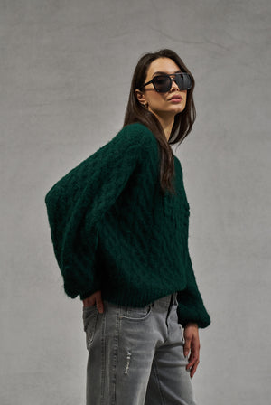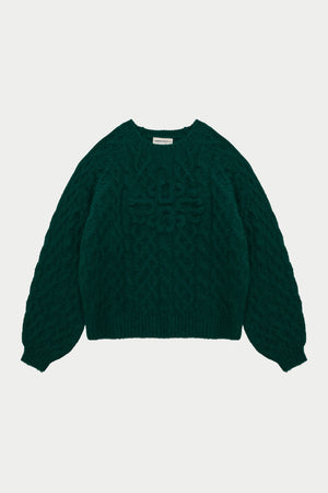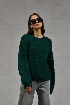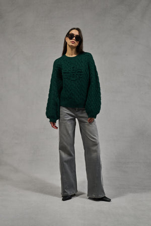 FLUFFY CABLE KNIT EMBLEM JUMPER - FOREST GREEN