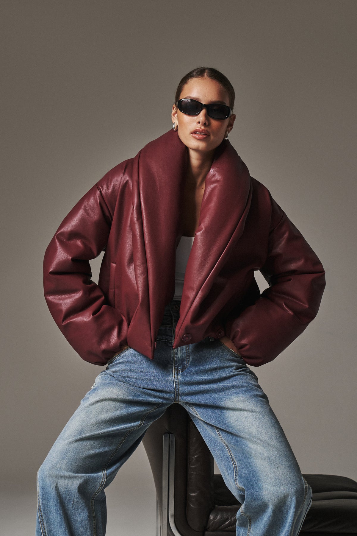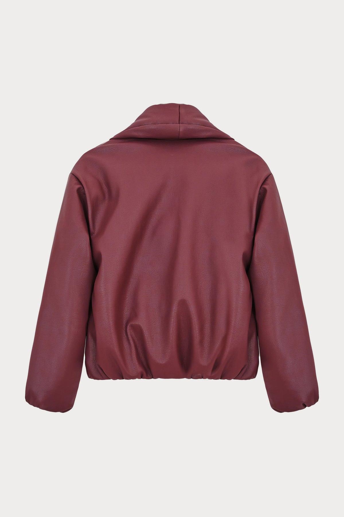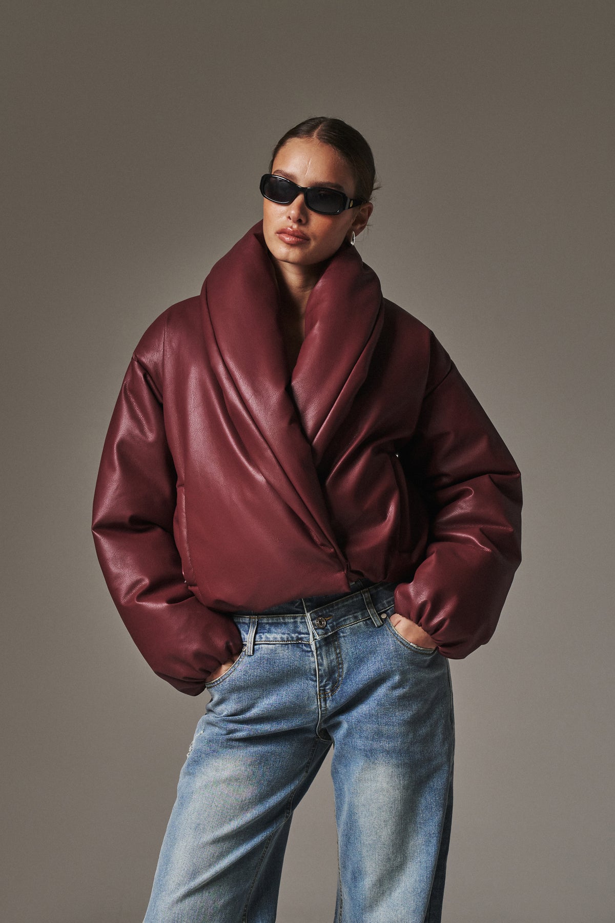 OVERSIZED COLLAR FAUX LEATHER PUFFER COAT - BURGUNDY