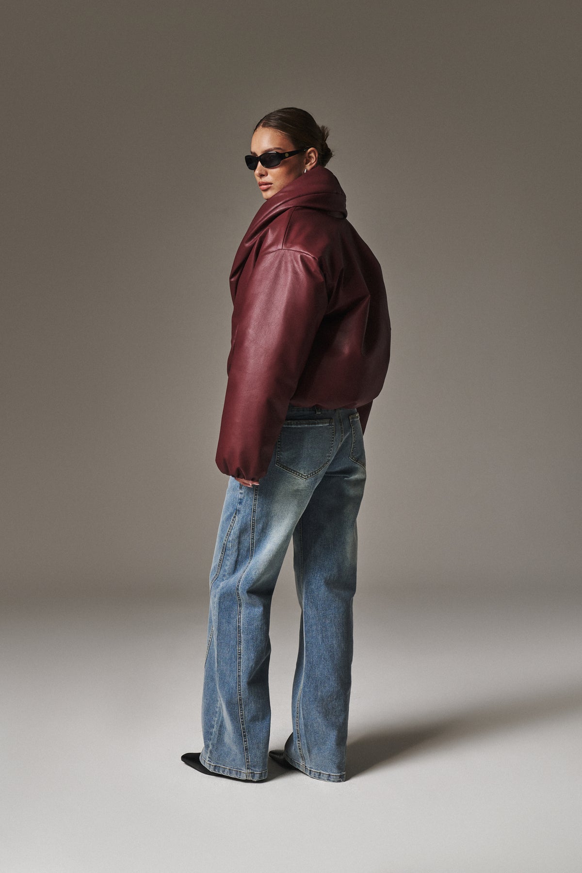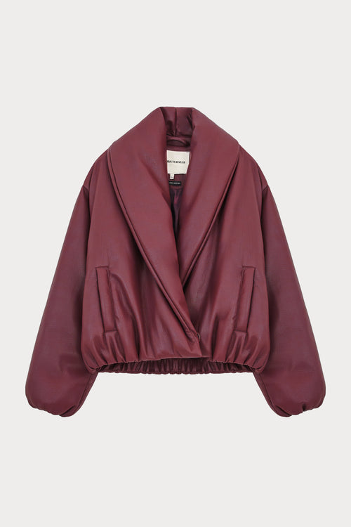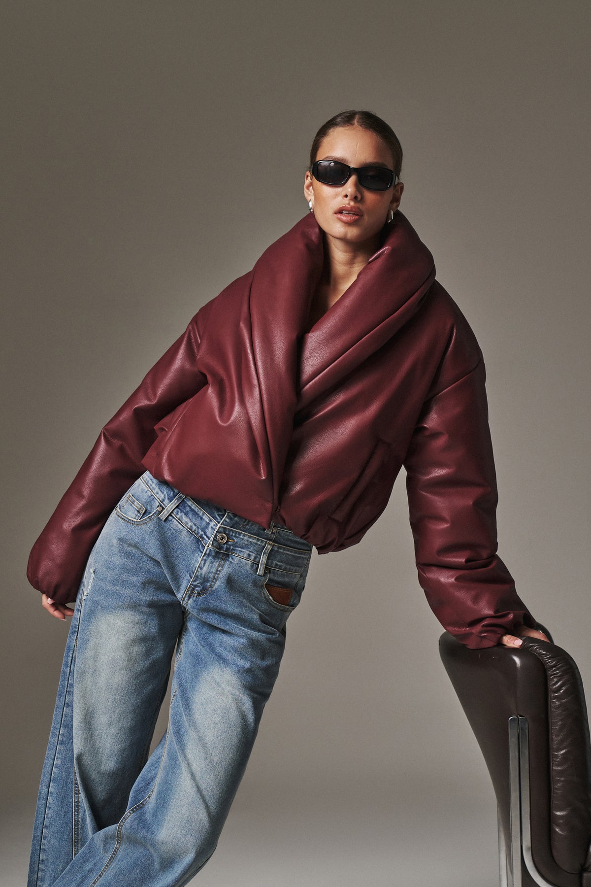 OVERSIZED COLLAR FAUX LEATHER PUFFER COAT - BURGUNDY