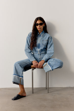 TURN UP HEM WIDE LEG JEANS - MID BLUE WASH
