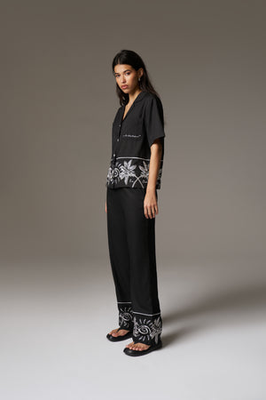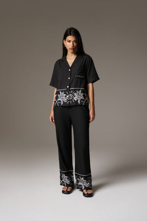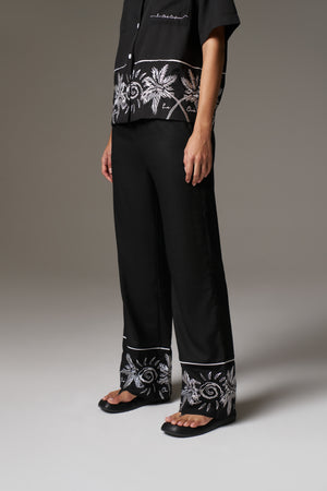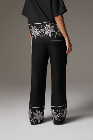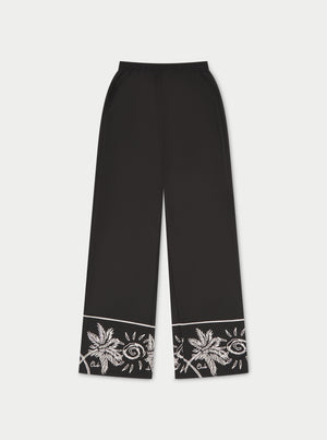 PALM EMBROIDERY WIDE LEG TROUSERS - BLACK