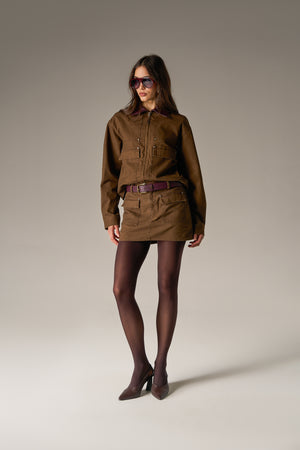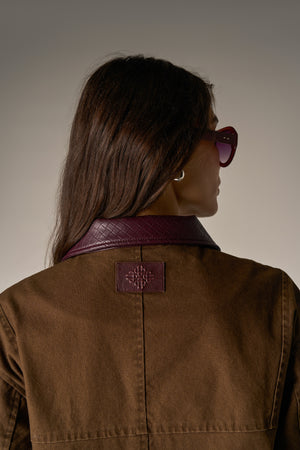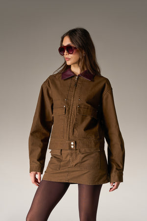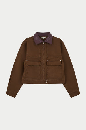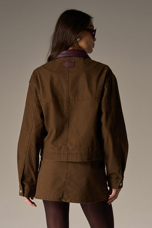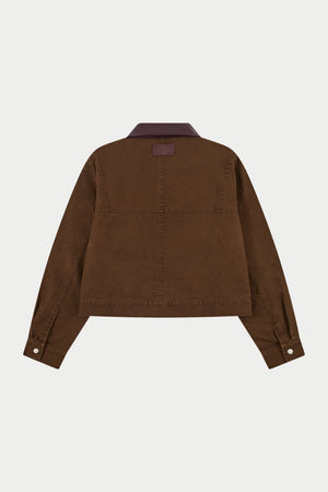 WASHED CONTRAST COLLAR TRUCKER JACKET - CHOCOLATE