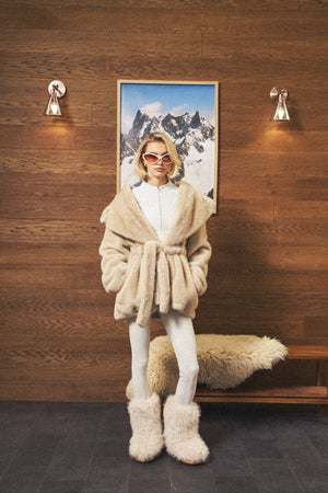 BELTED FAUX FUR HOODED COAT - BEIGE