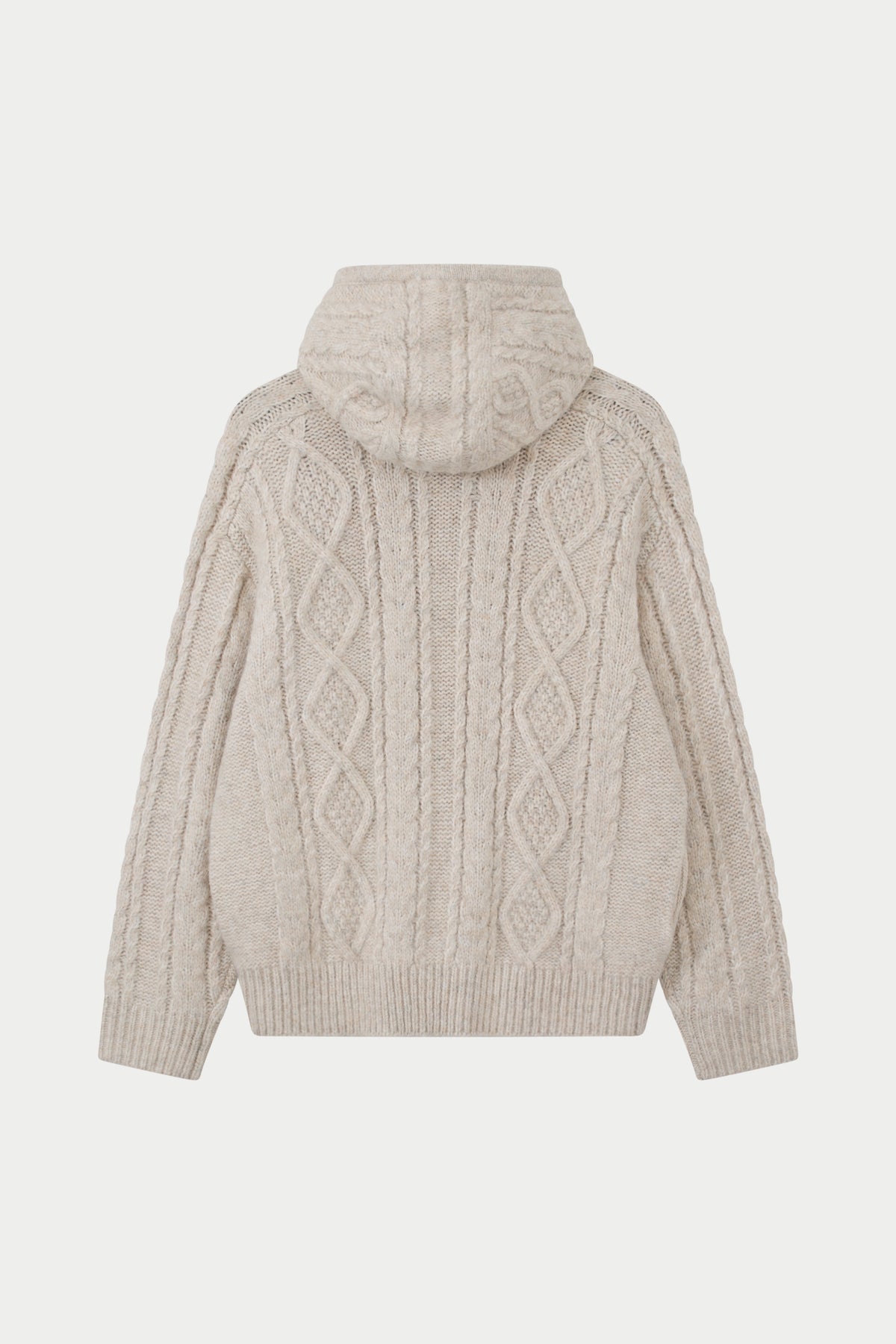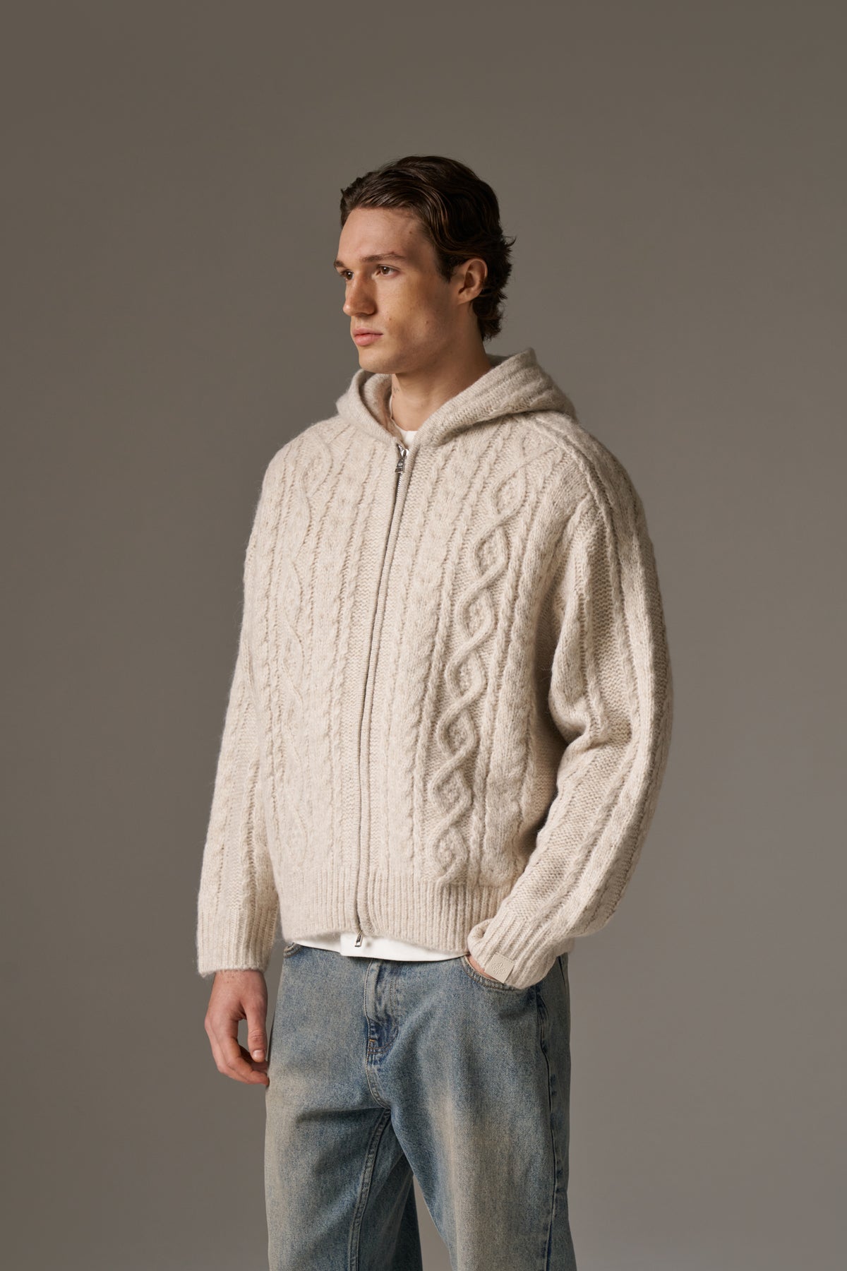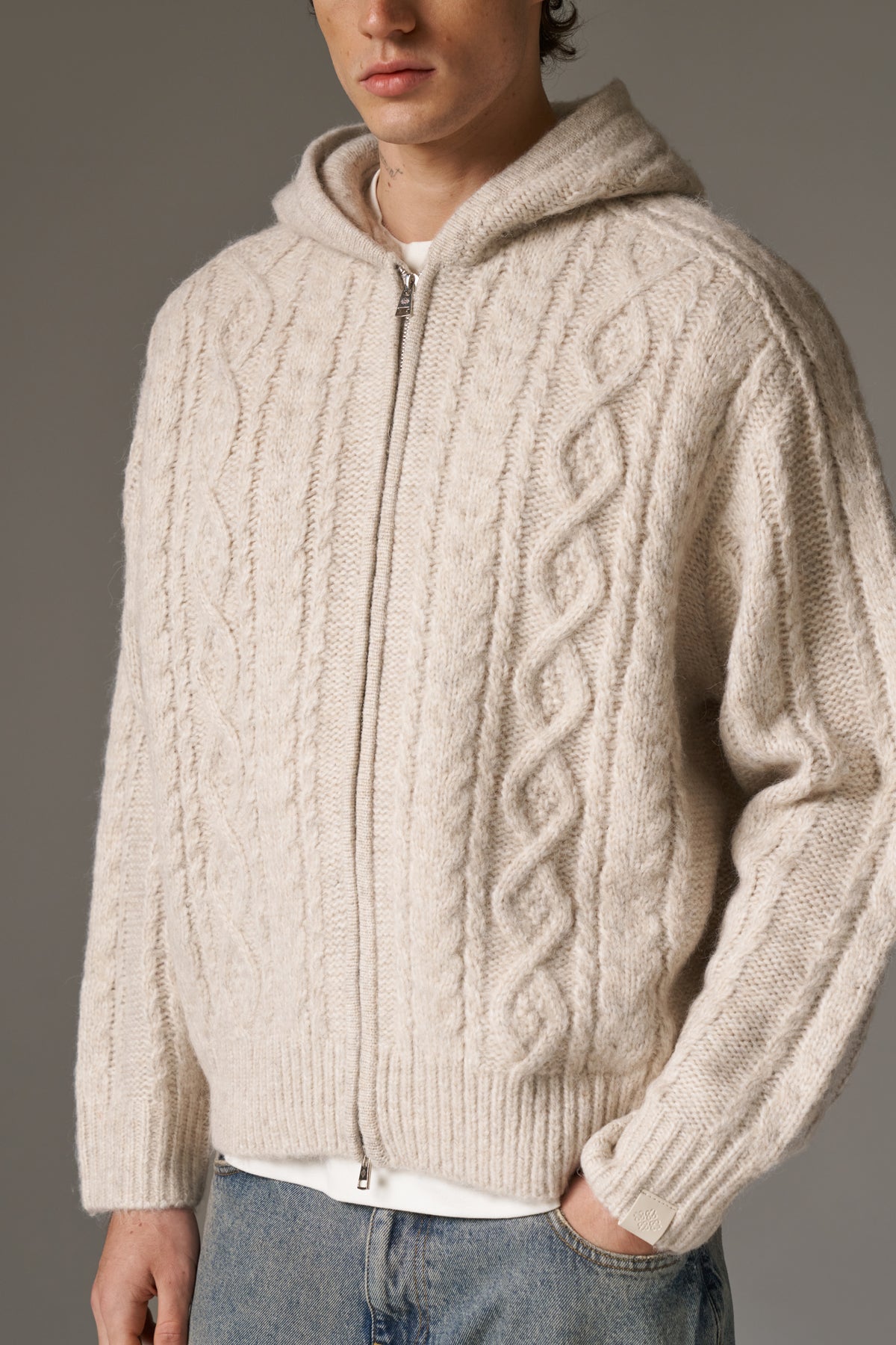 CABLE KNIT ZIP THROUGH HOODIE - STONE