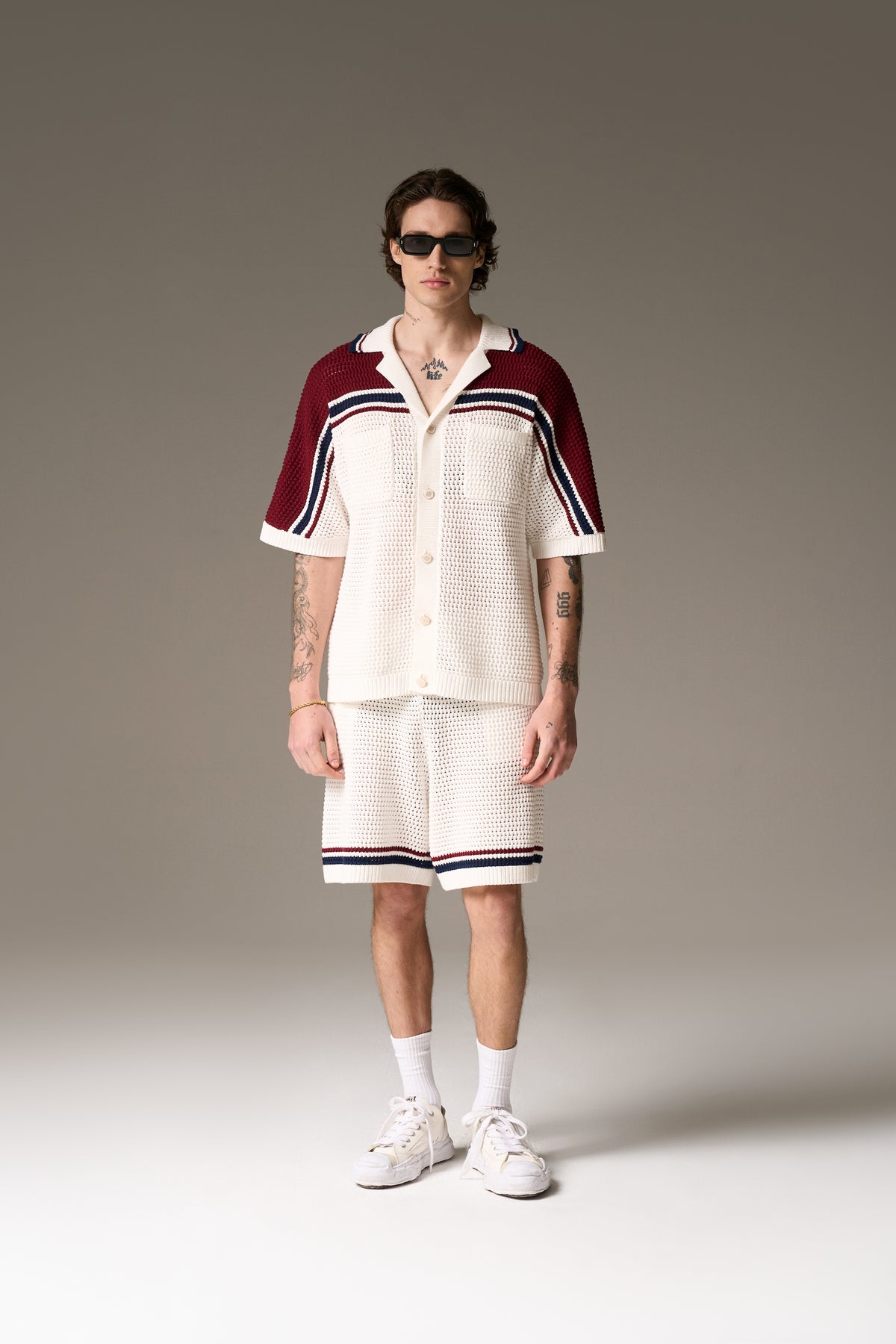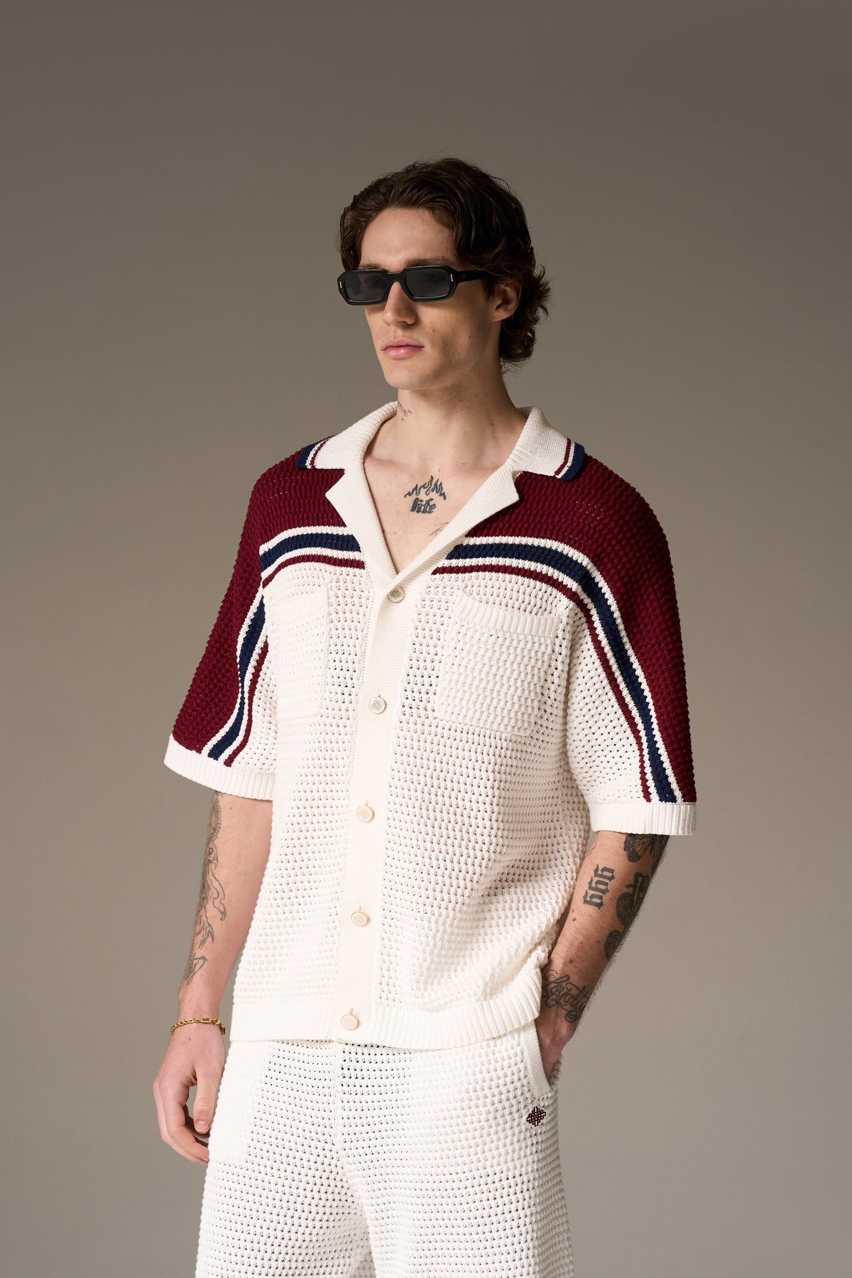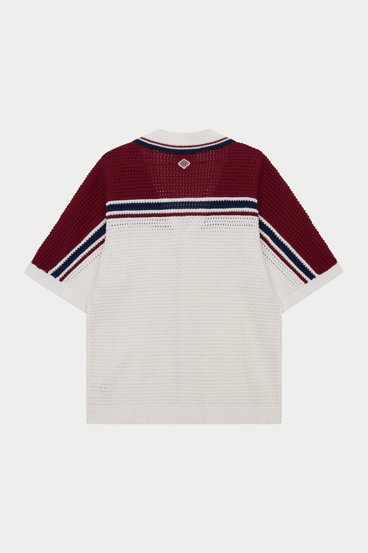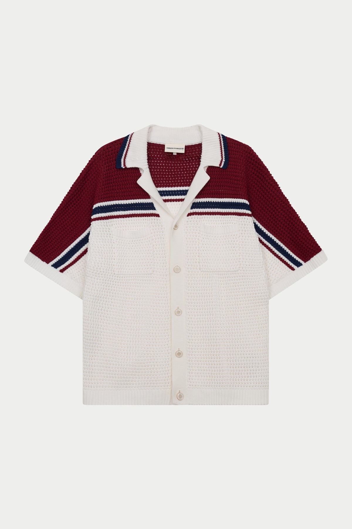 COLOUR BLOCK KNITTED STRIPE SHIRT - BURGUNDY