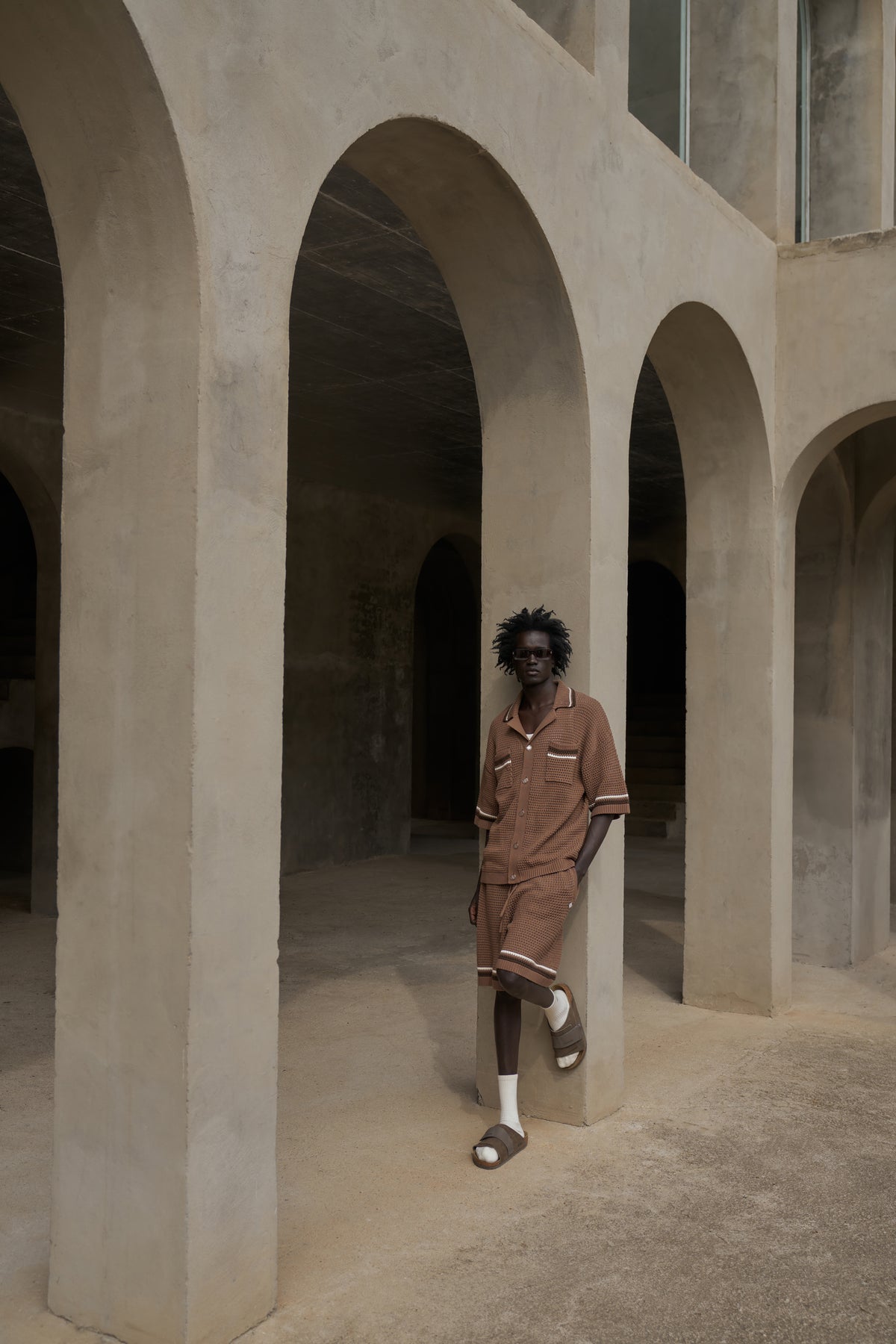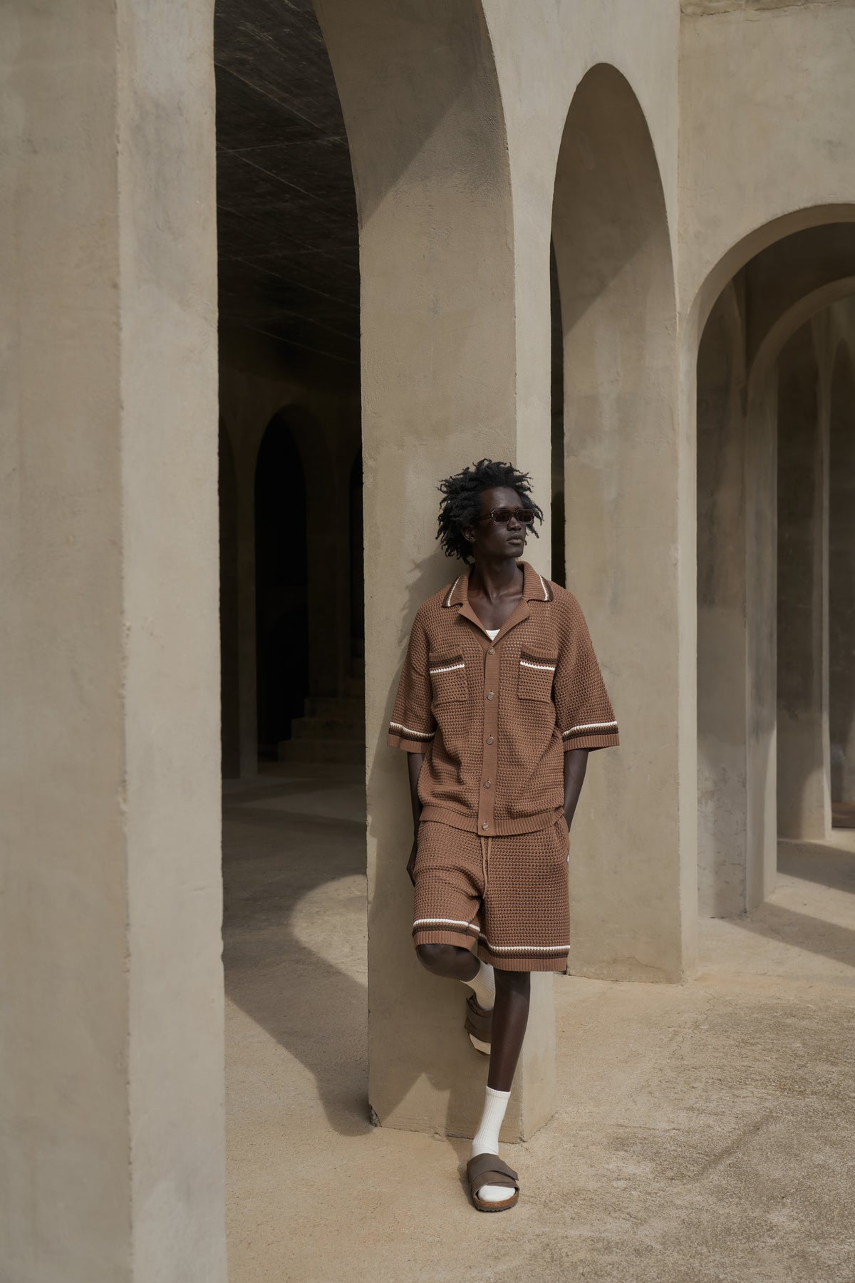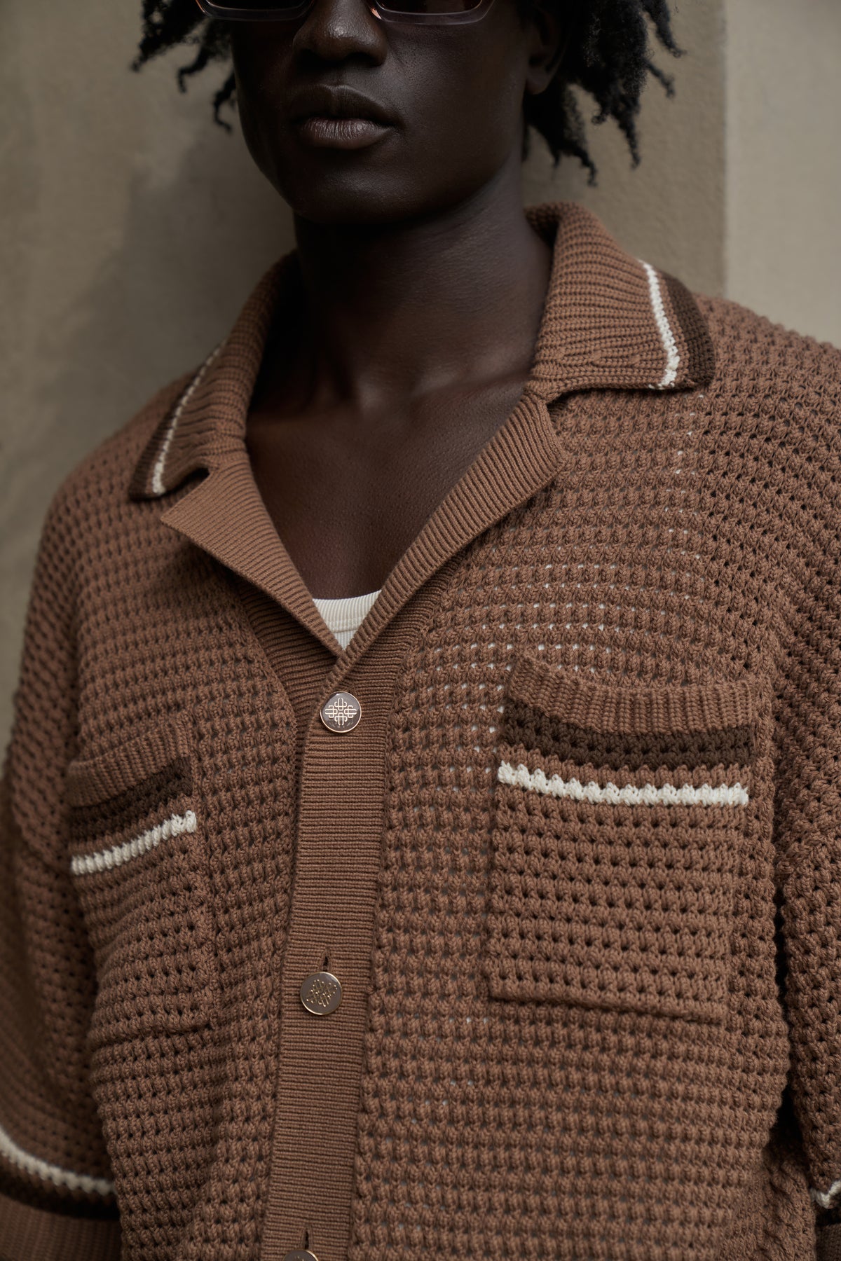 CROCHET KNITTED STRIPE SHIRT - BROWN