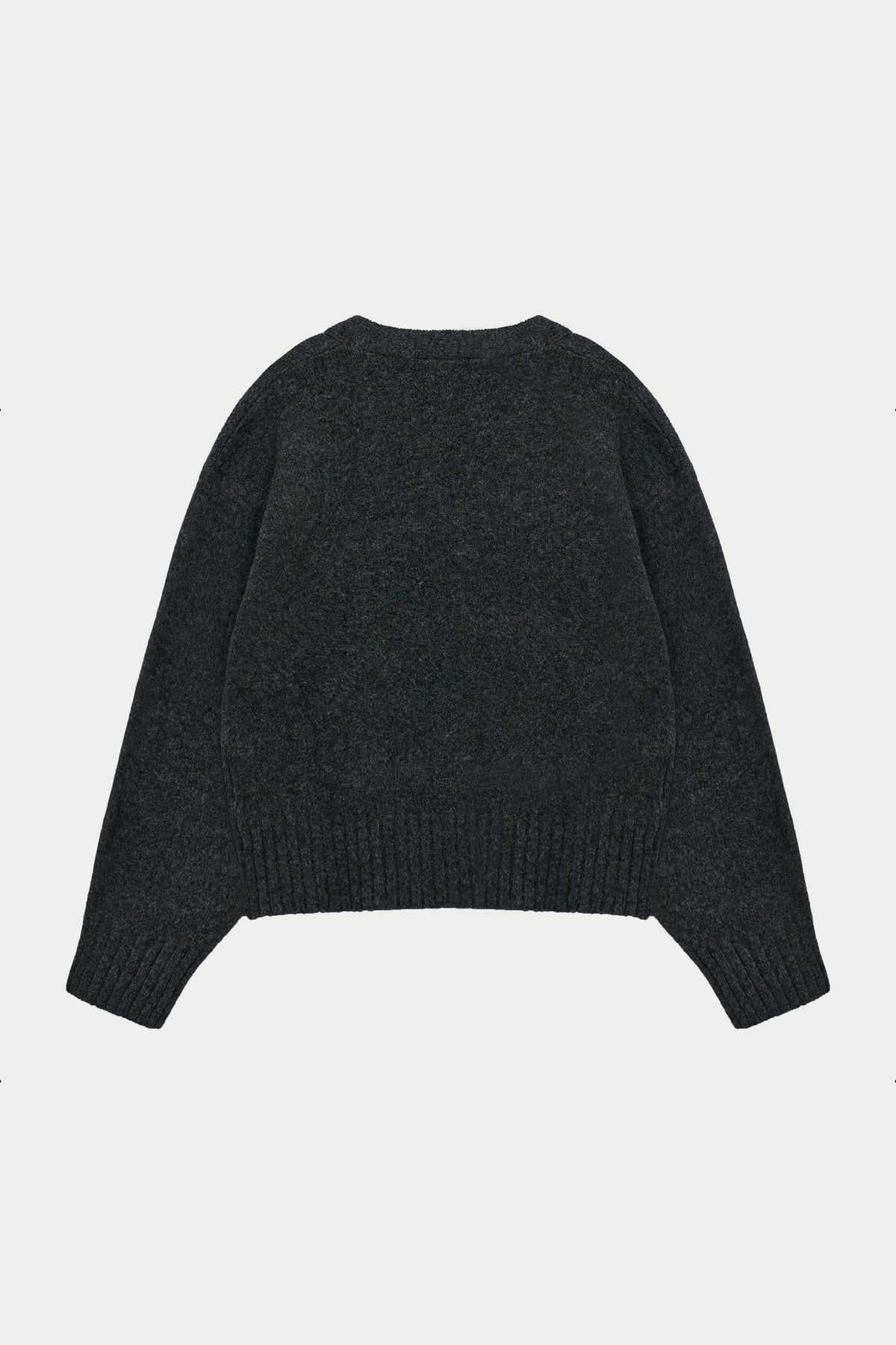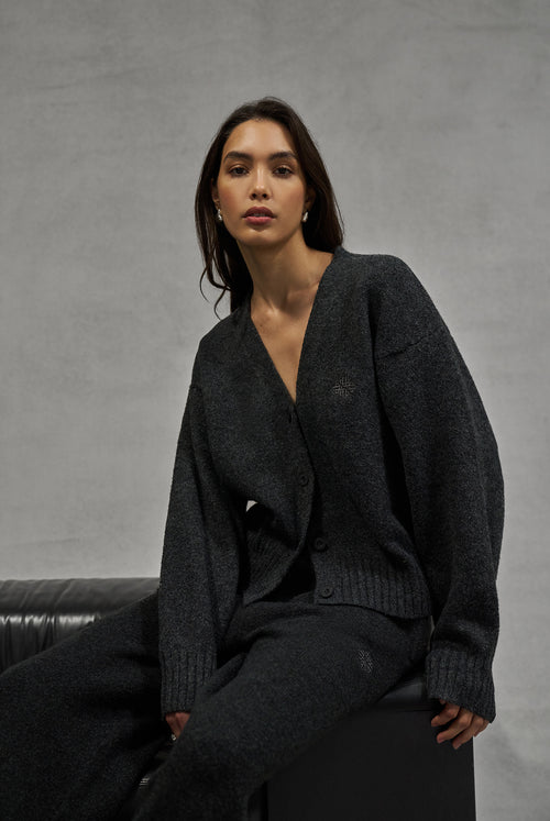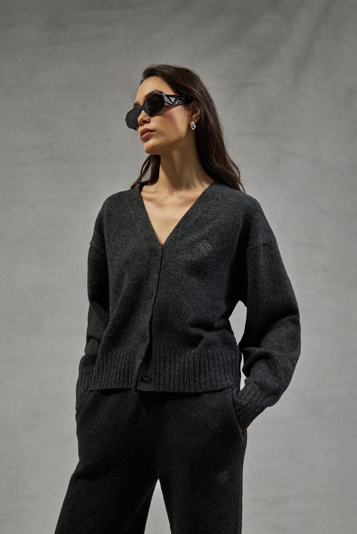 FLUFFY KNIT EMBLEM EMBROIDERED CARDIGAN - CHARCOAL