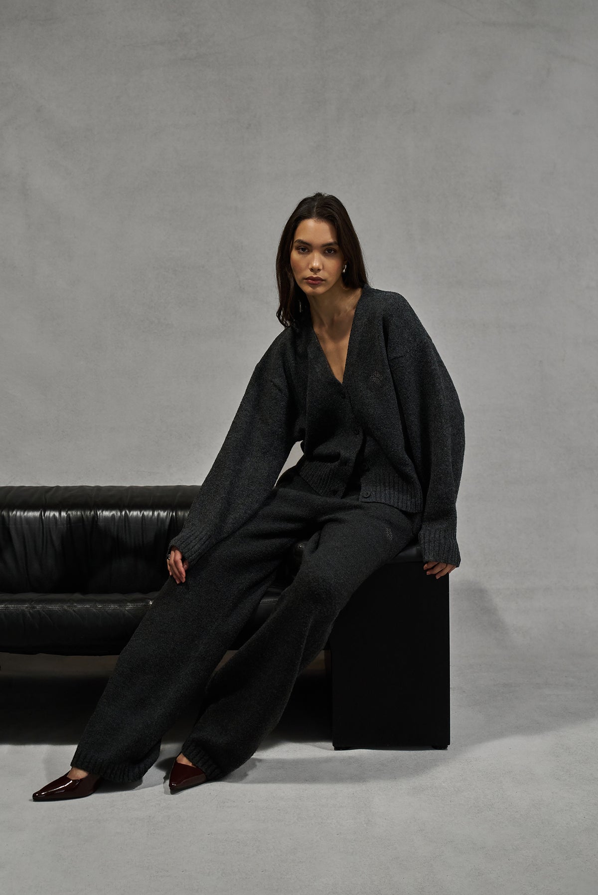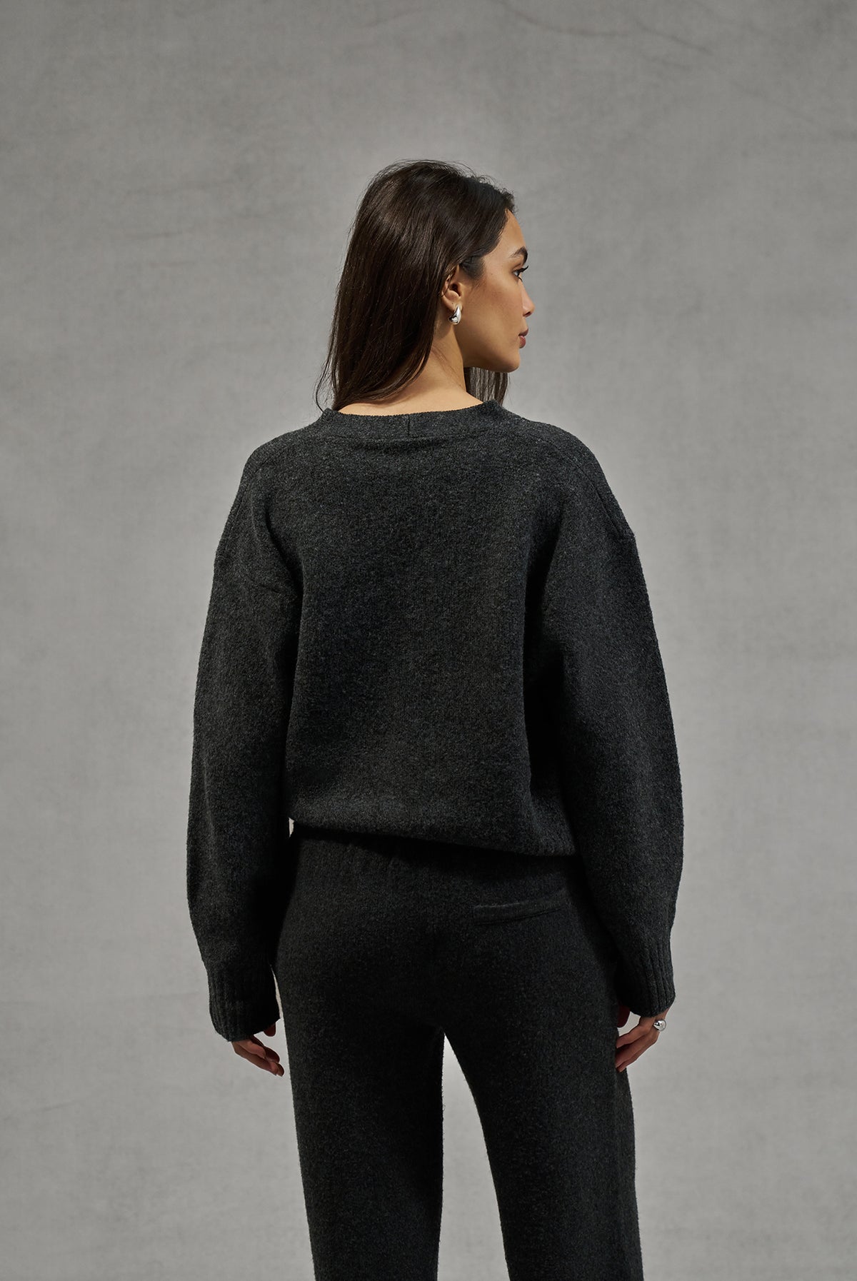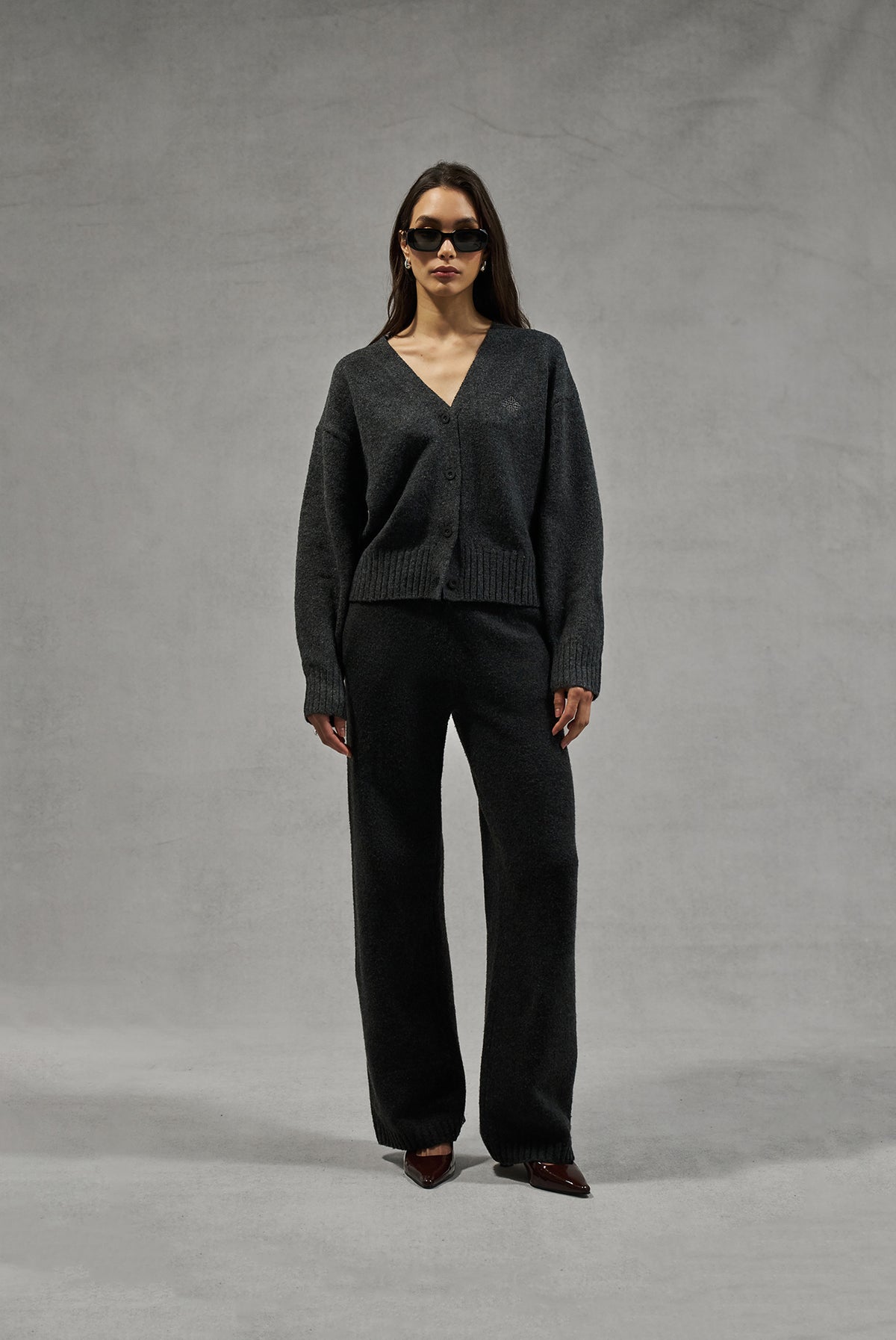 FLUFFY KNIT EMBLEM EMBROIDERED CARDIGAN - CHARCOAL