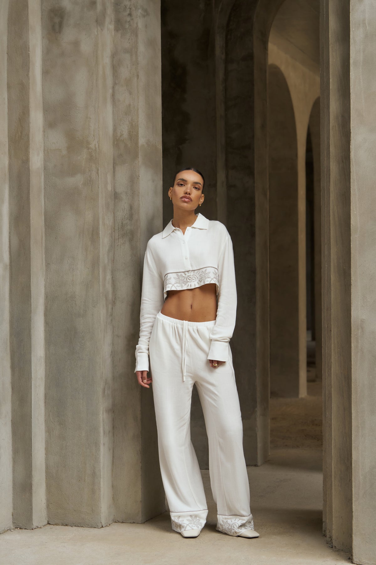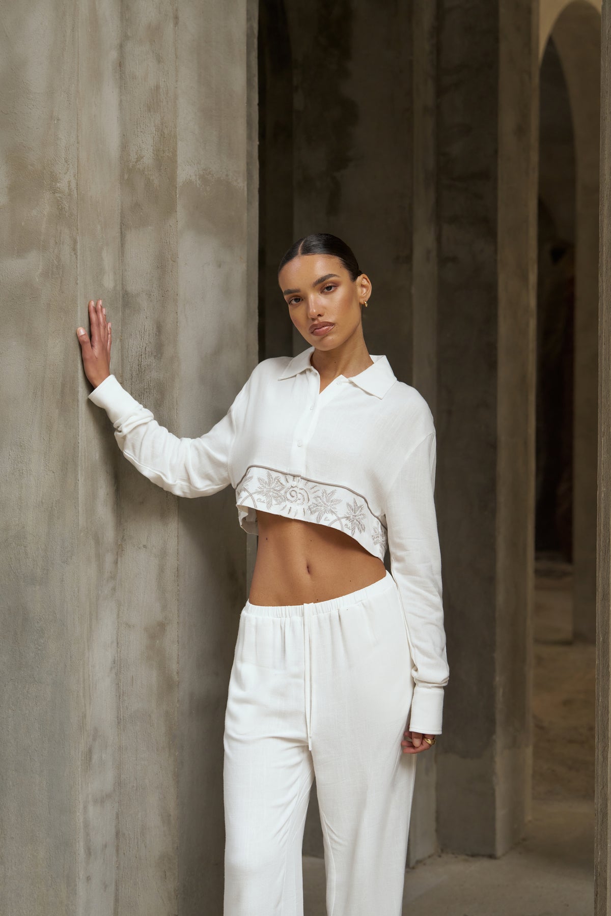 PALM EMBROIDERED CROPPED SHIRT - OFF WHITE
