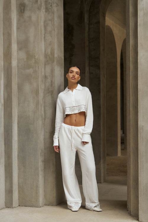 PALM EMBROIDERED WIDE LEG TROUSERS - OFF WHITE