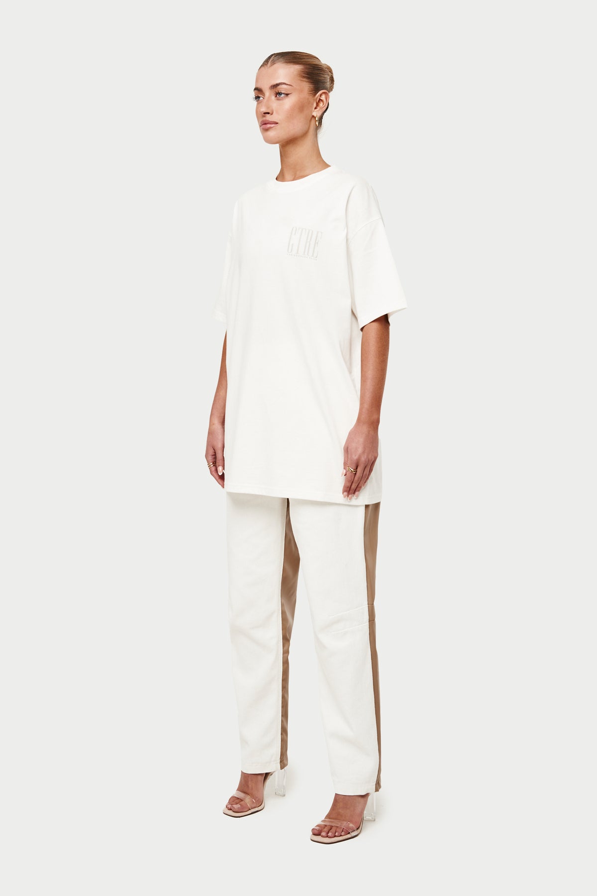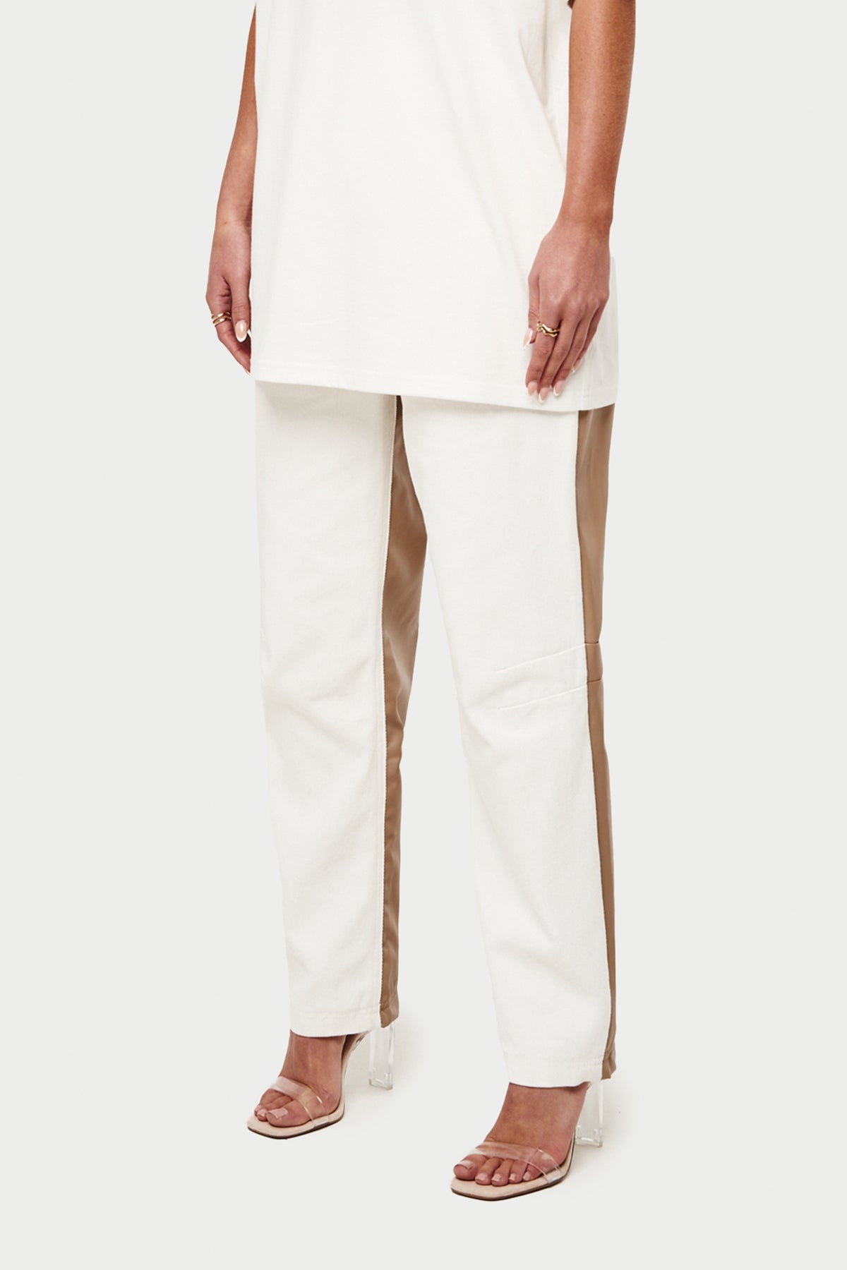 PU SPLICED DENIM JEANS - OFF WHITE/BEIGE