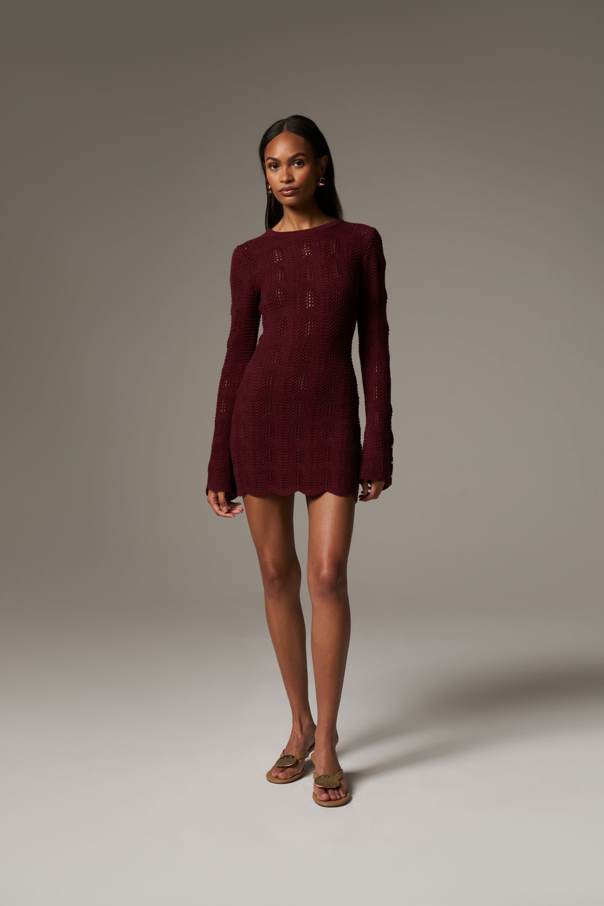 - Long sleeved scallop edge knitted mini dress