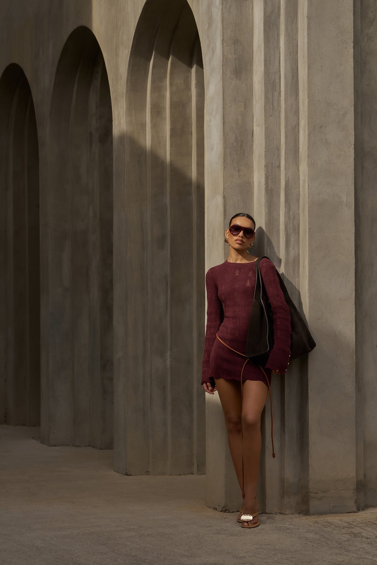 SCALLOP EDGE KNITTED MINI DRESS - BURGUNDY