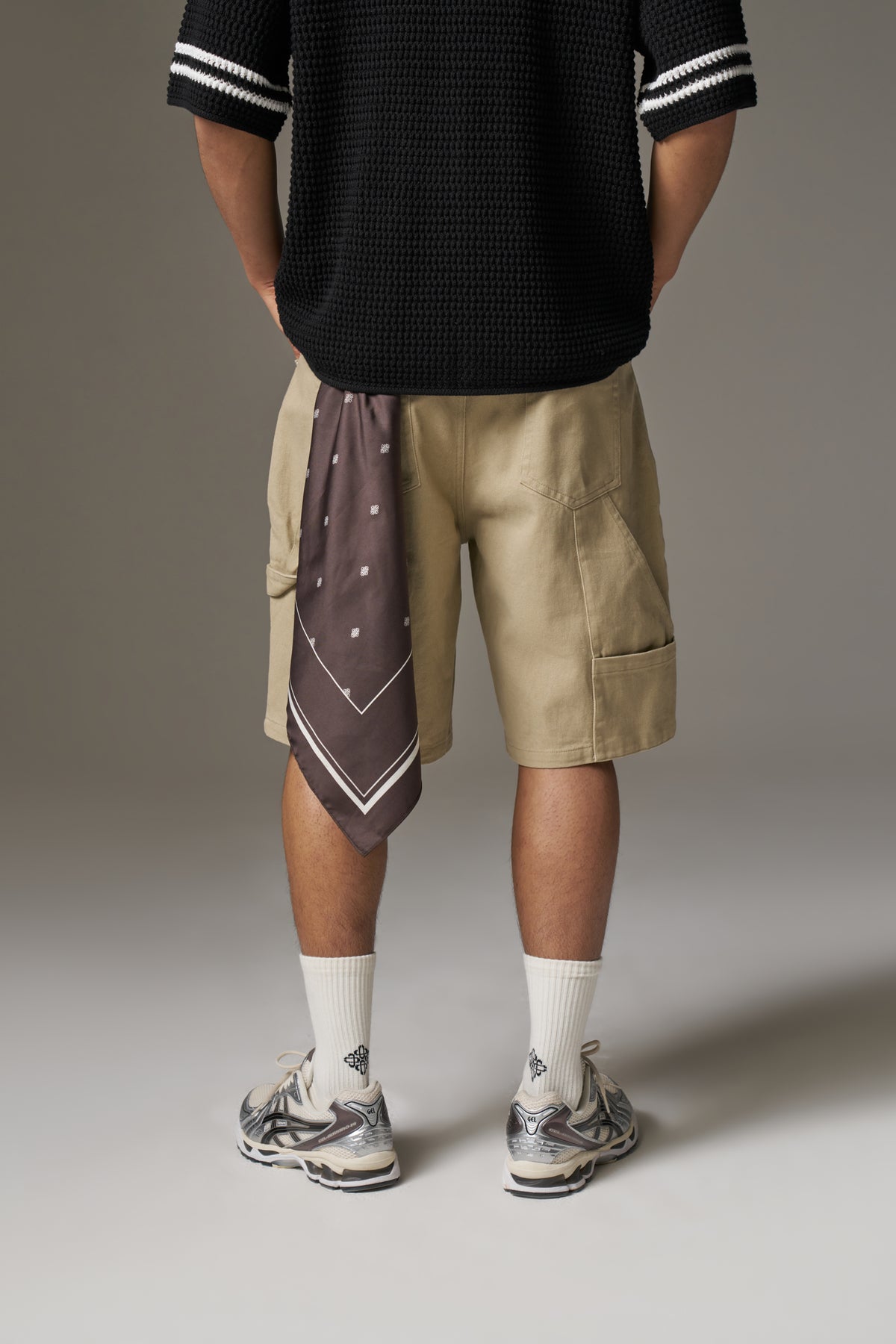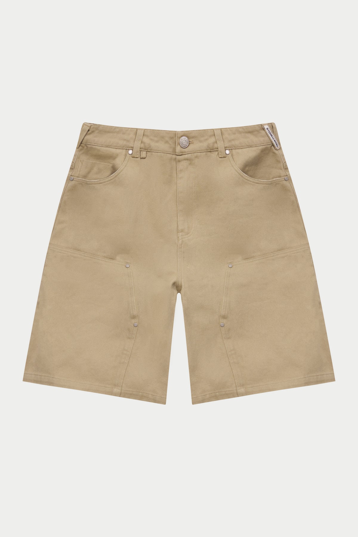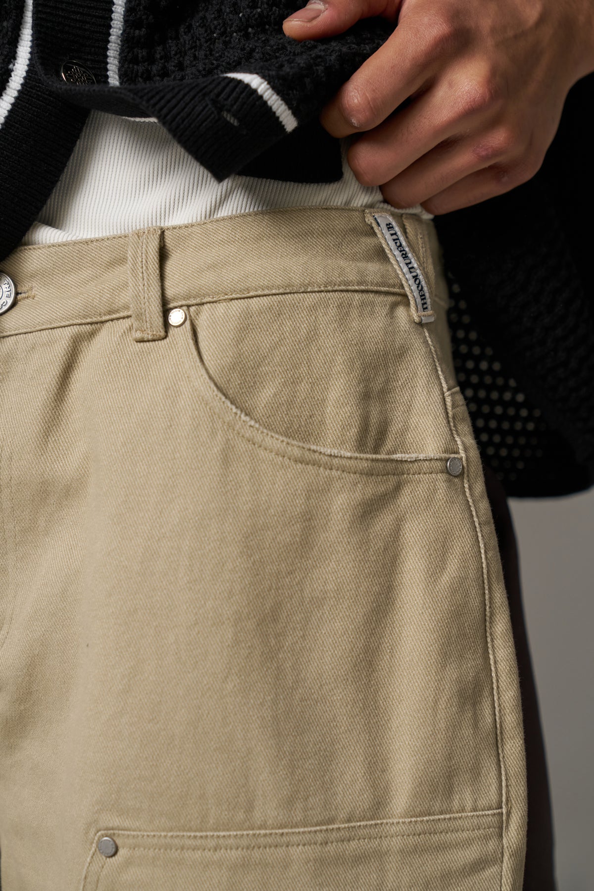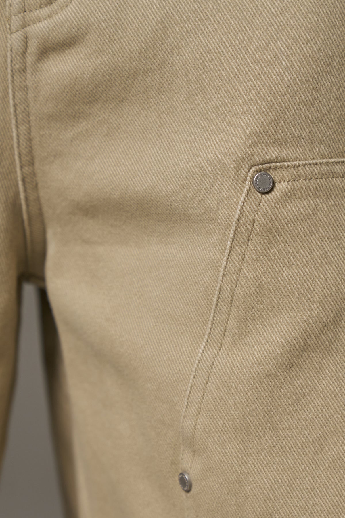 - Self fabric double carpenter panels with branded brushed silver rivets