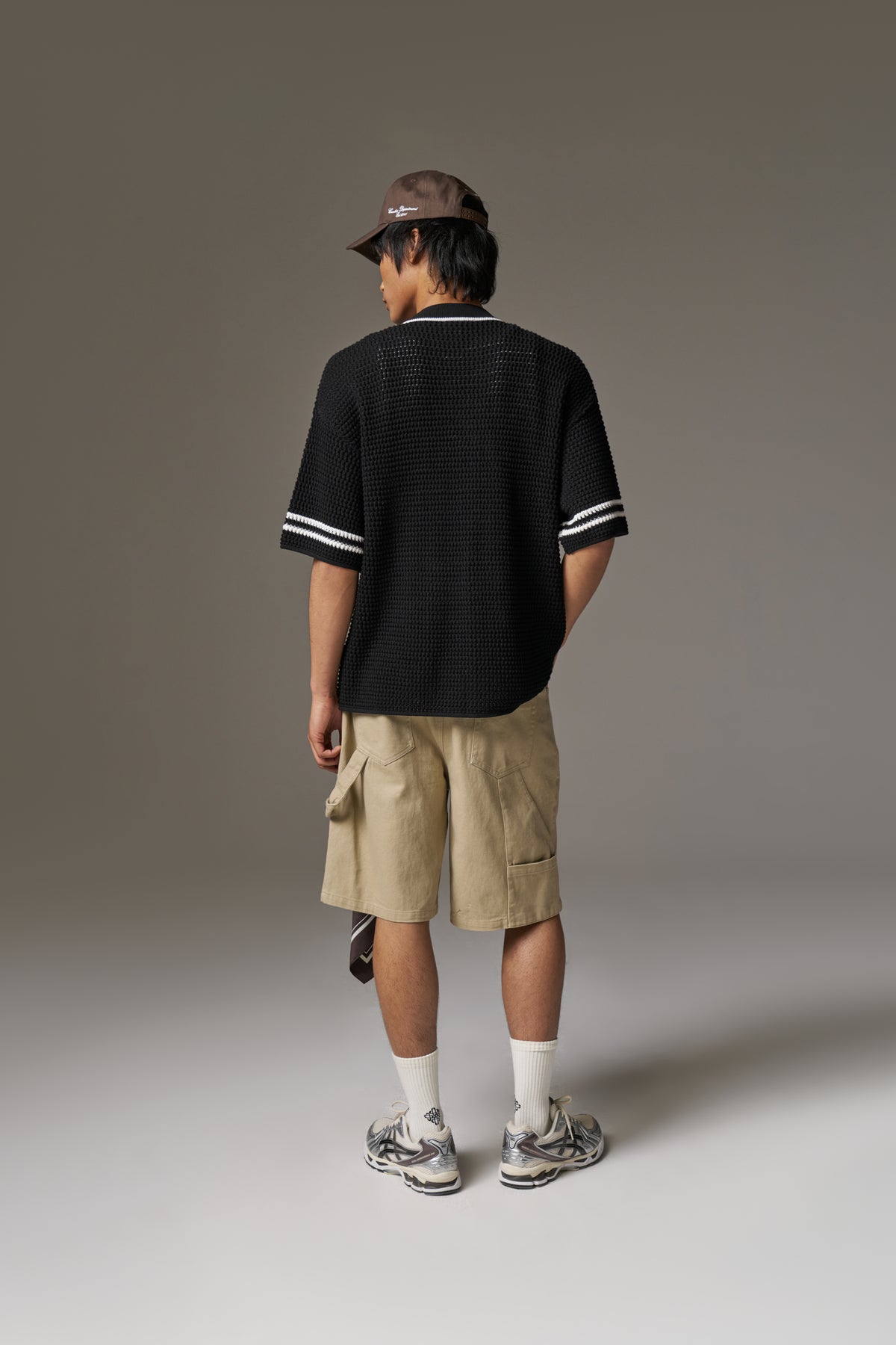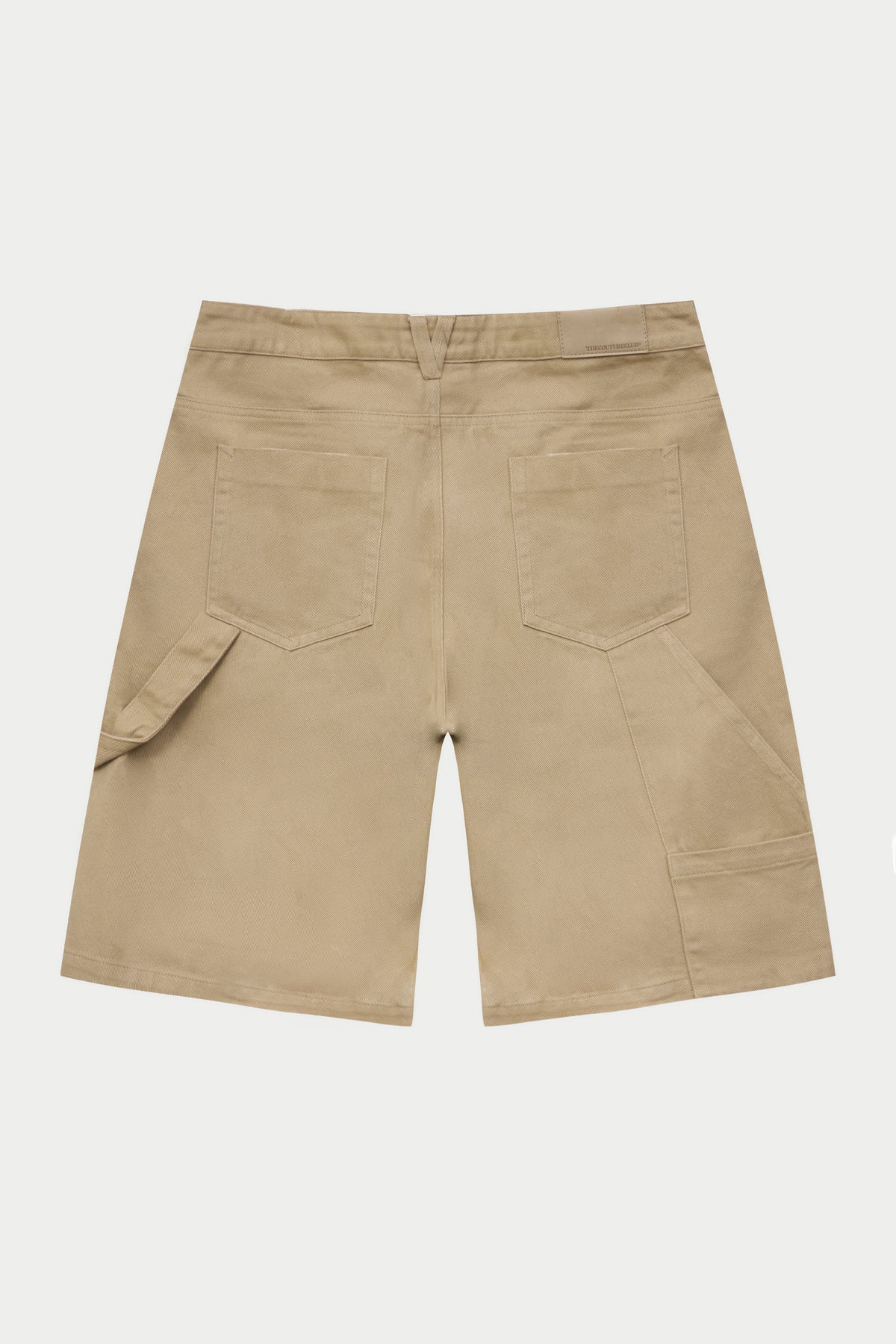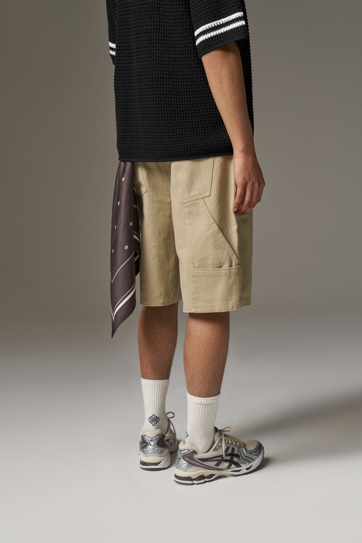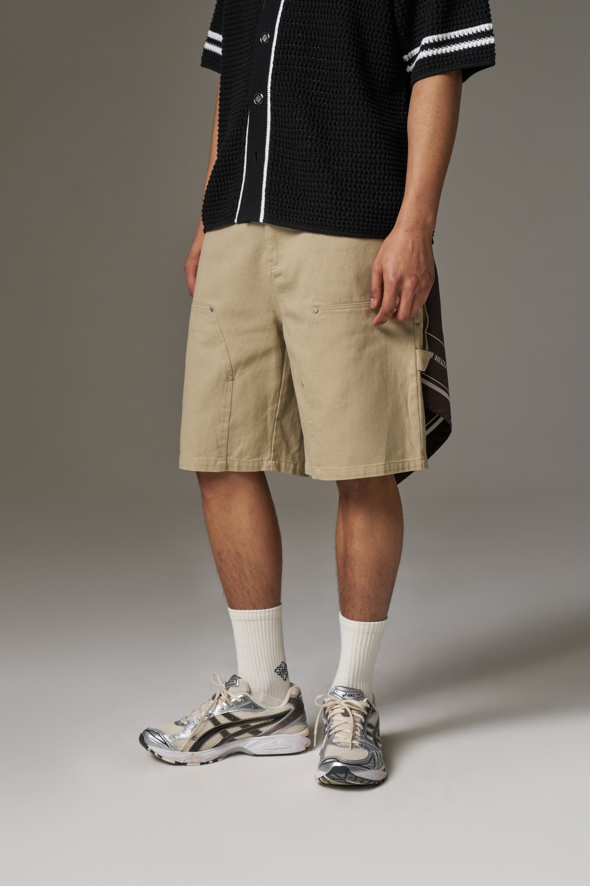 - Self fabric double carpenter panels with branded brushed silver rivets
