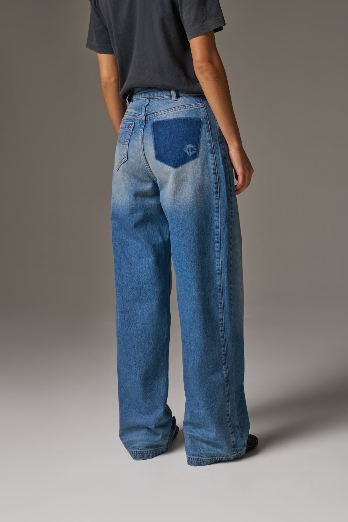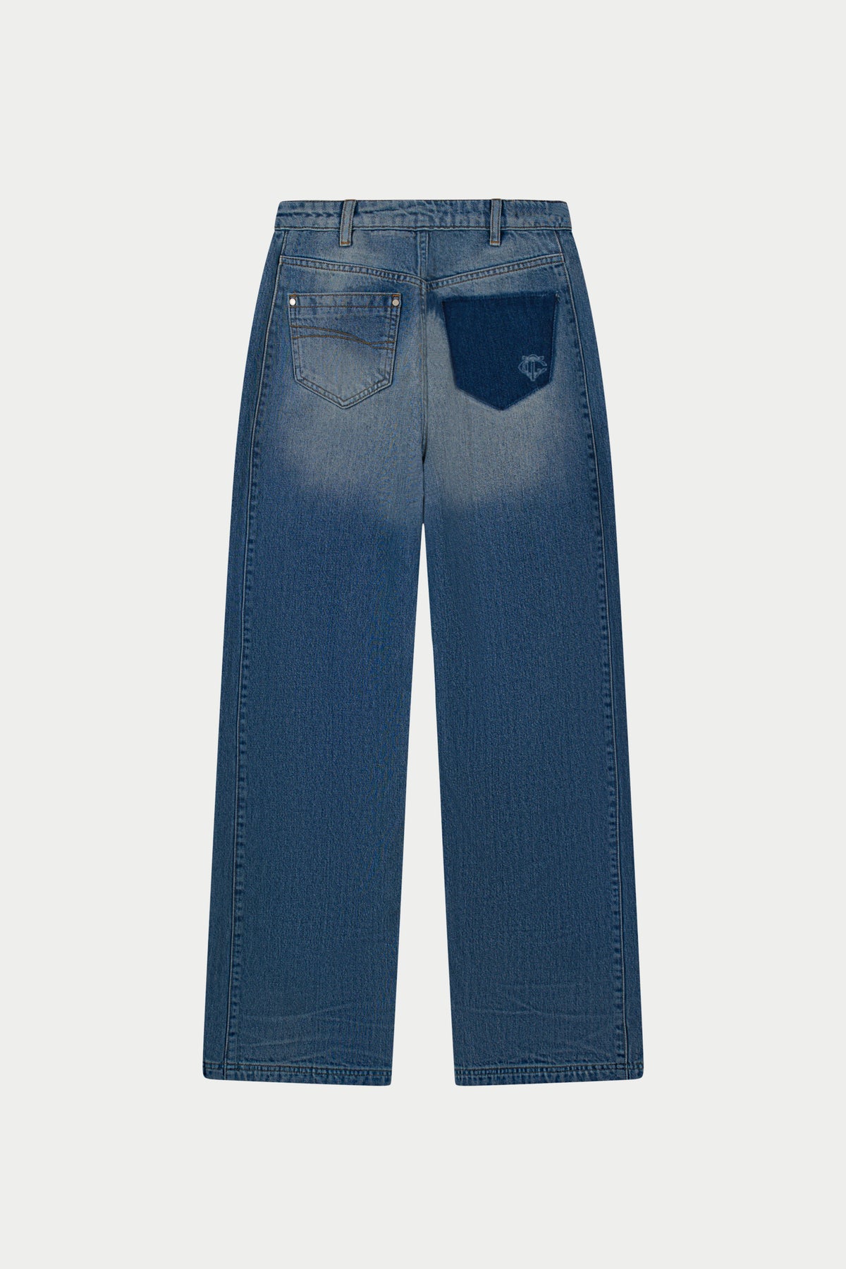 VINTAGE WASH MID RISE EMBLEM STRAIGHT LEG JEANS - BLUE WASH