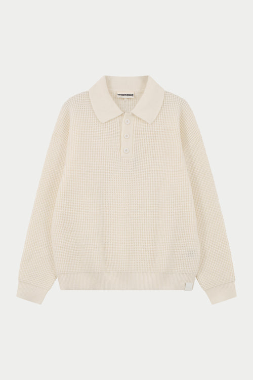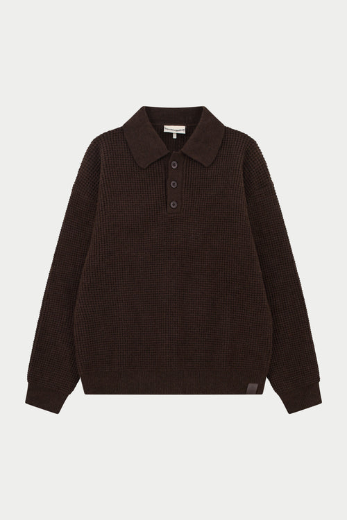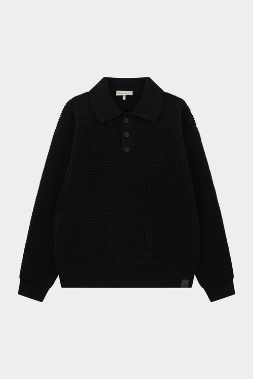 WAFFLE KNIT LONG SLEEVE POLO - BLACK