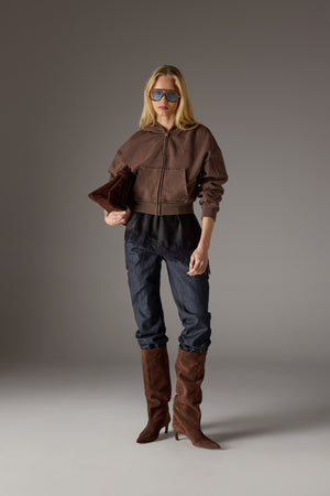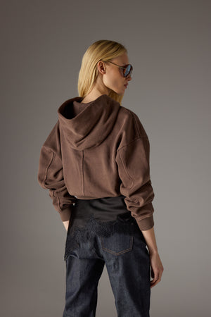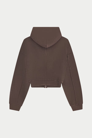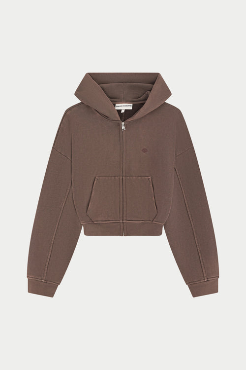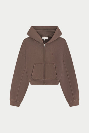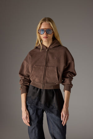 WASHED ZIP THROUGH CROPPED HOODIE - CHOCOLATE