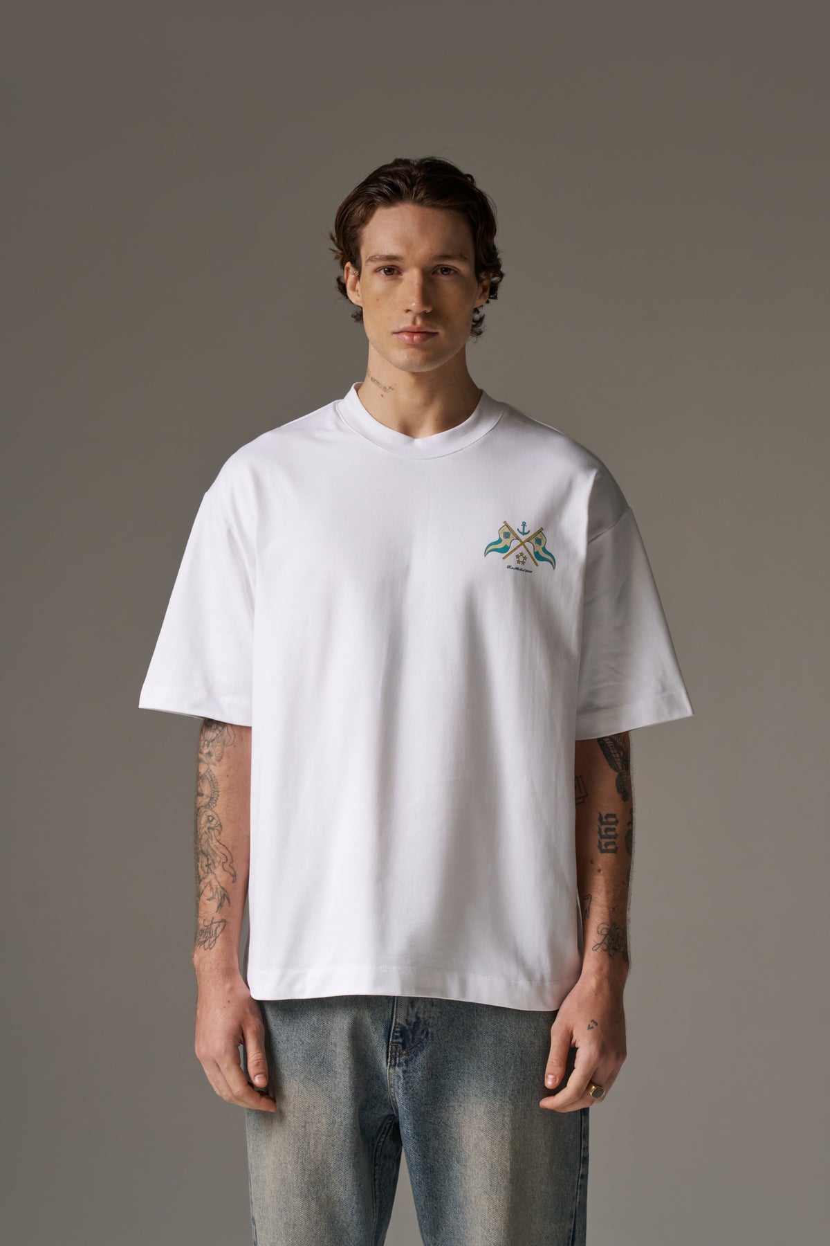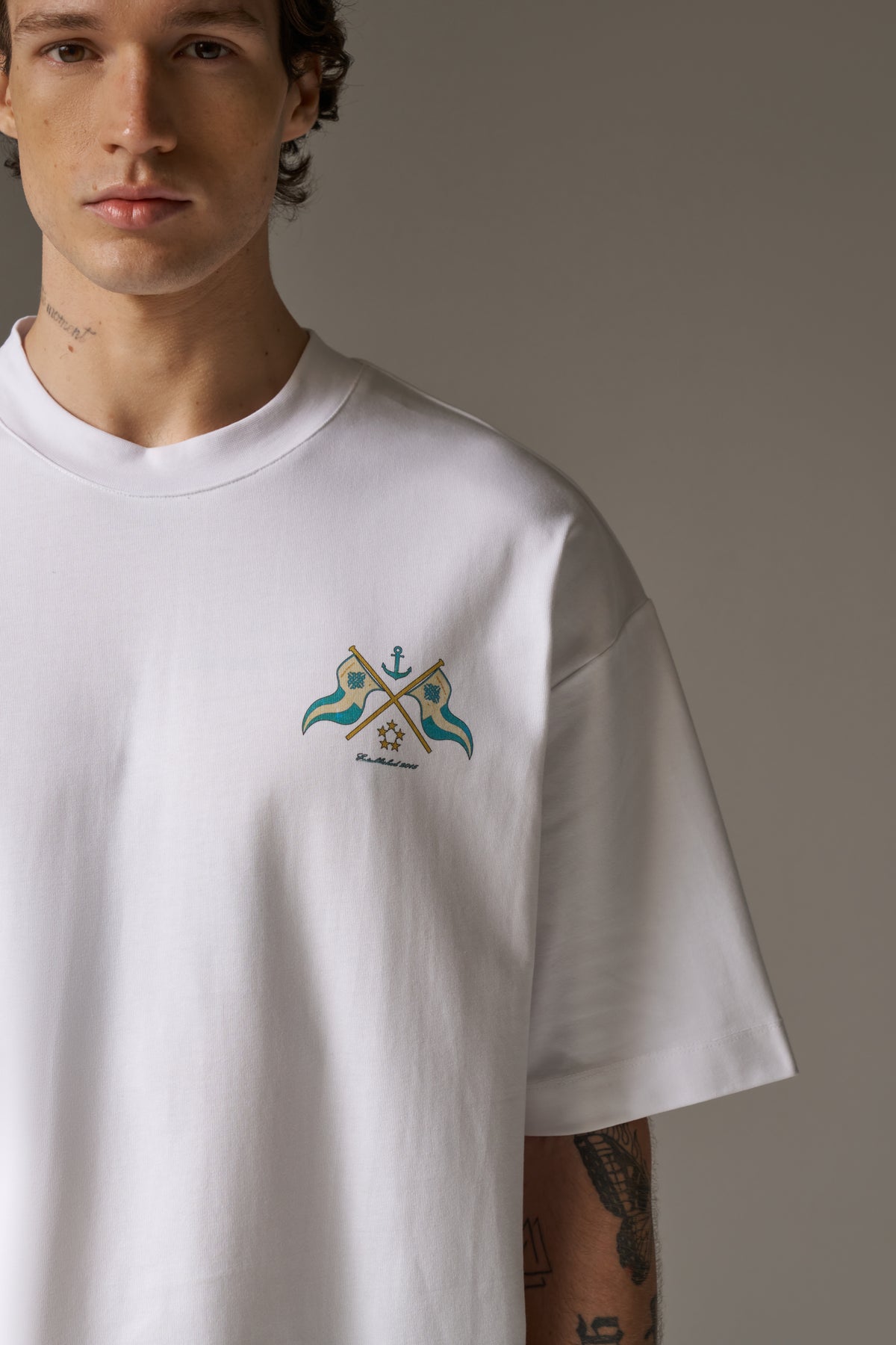 - Small digital print artwork to front left of chest